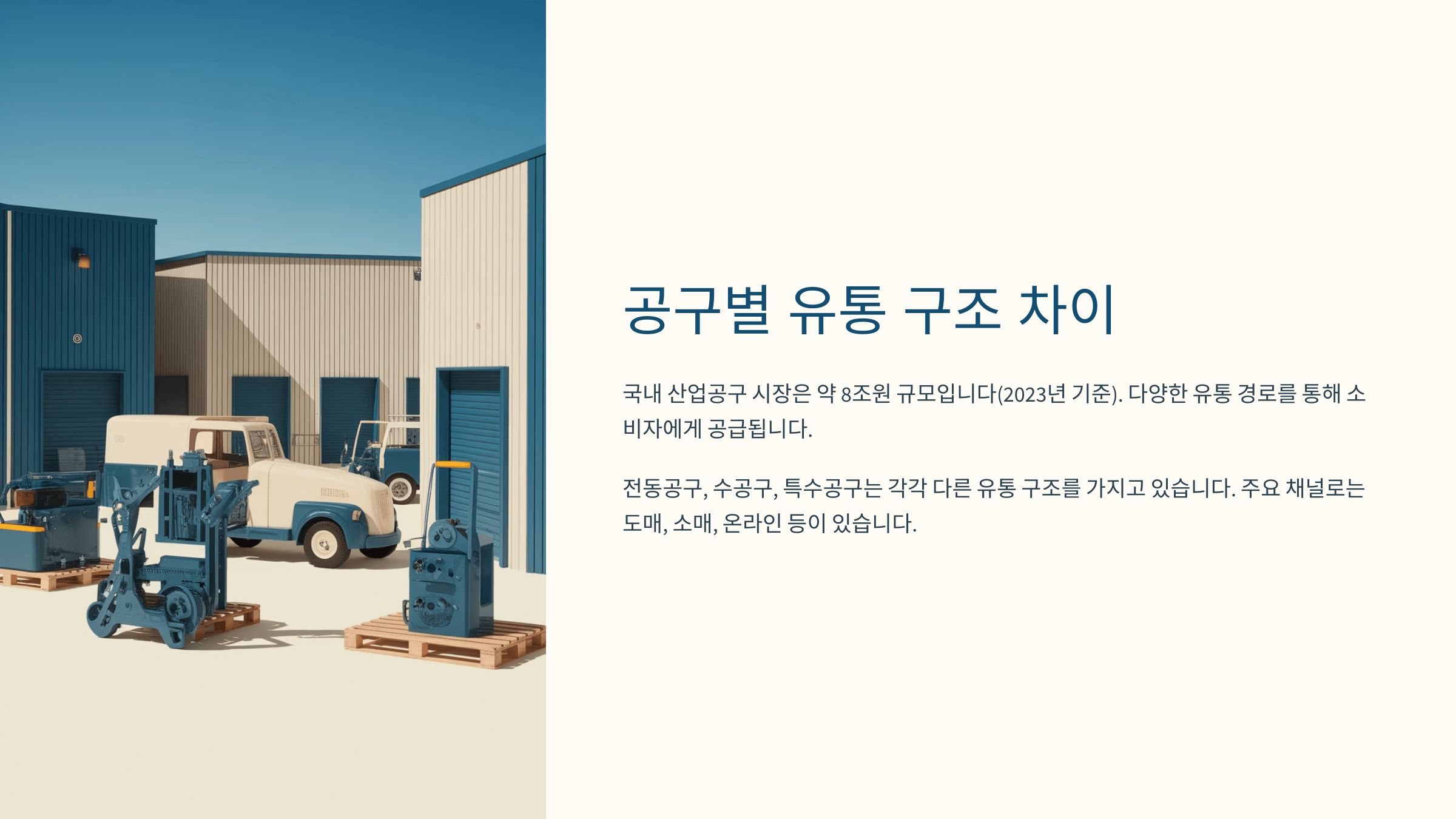 지금까지 전동공구, 수공구, 고가 제품, 부품, 특수 공구의 유통에 대해 알아봤어요. 이어지는 내용에서는 이 모든 걸 바탕으로 카테고리별로 어떤 유통 전략이 필요한지 자세히 살펴보려고 해요 📝