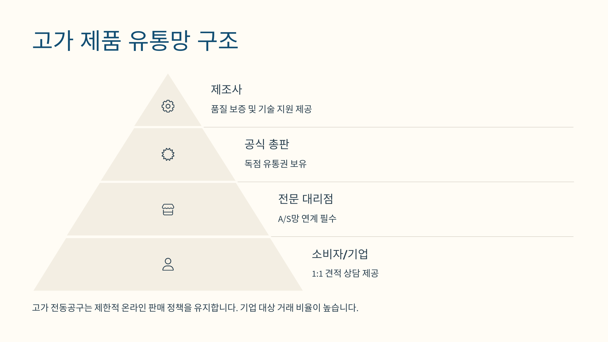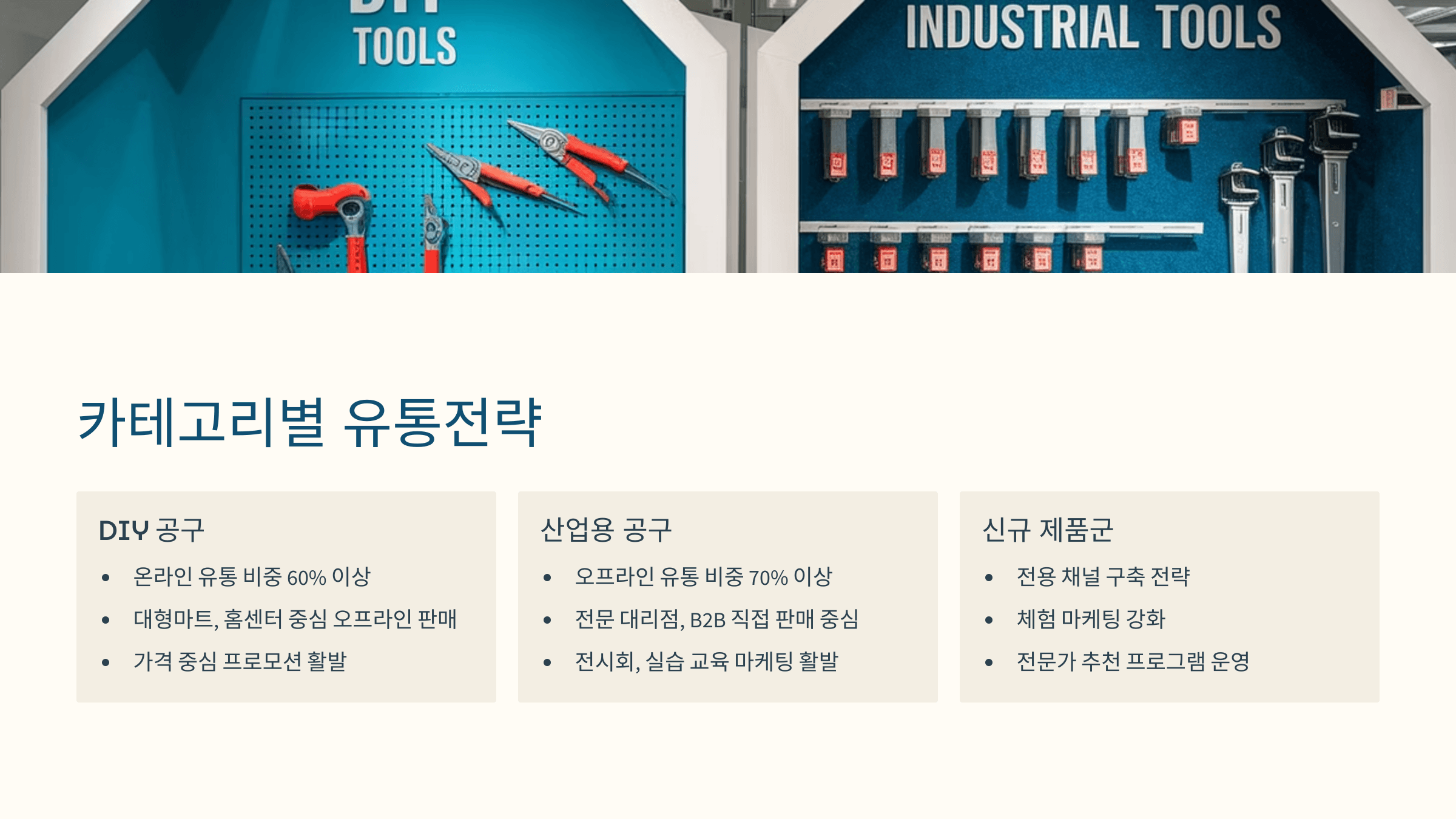 공구 시장의 유통 전략은 카테고리별로 다르게 설계돼야 해요. 전동공구는 전문성과 브랜드 신뢰도가 중요하기 때문에 공식 대리점 중심의 채널 관리가 핵심이에요. 수공구는 가격 경쟁력이 강하기 때문에 대형 유통망과 온라인 마케팅이 중요한 전략 포인트예요.
