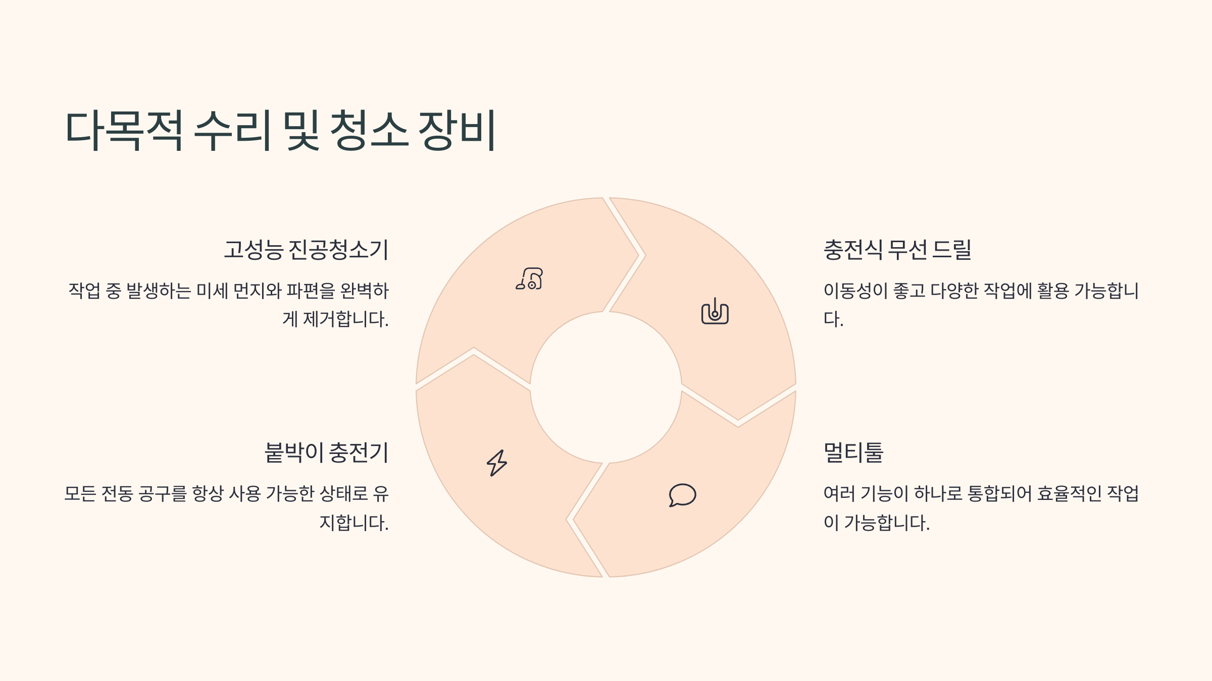 | 전동공구 연결 | 드릴/톱 등 분진 자동 흡입 | 타공 작업 필수 |