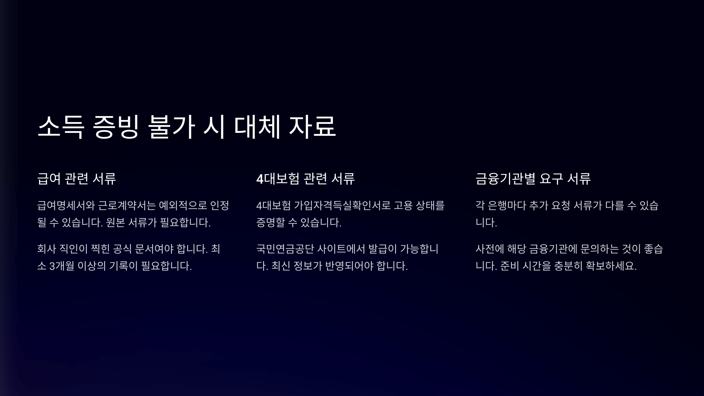 A1. 꼭 그런 건 아니에요. 기본 증빙이 부족하면 대체 서류로 보완할 수 있어요. 단, 소득 자체가 없거나 입증이 불가능하면 거절될 수 있어요.</p A network error occurred. Please check your connection and try again. If this issue persists please contact us through our help center at help.openai.com. 나의 말: 계속 ChatGPT의 말: html 복사 편집