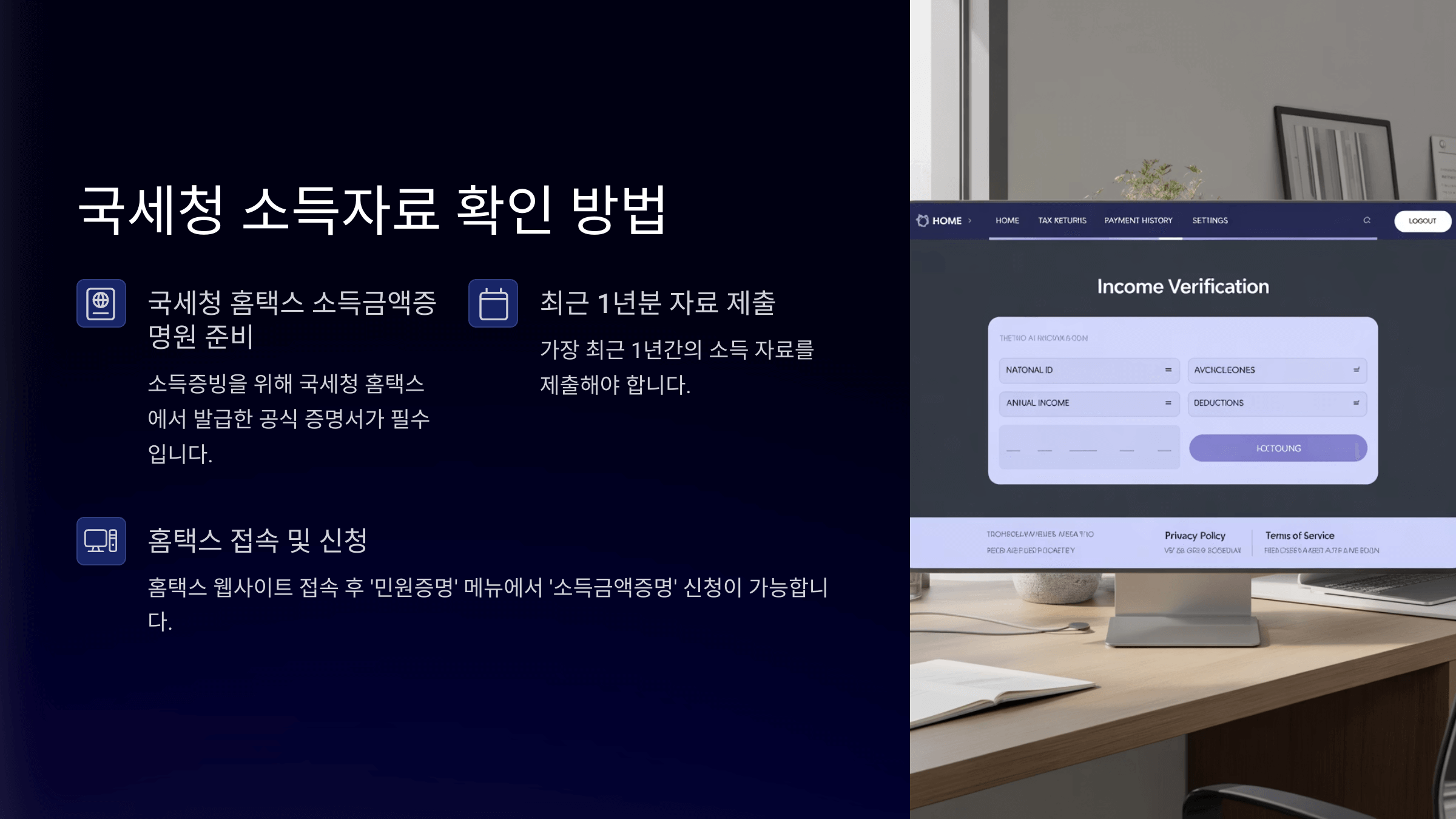 예를 들어 근로자의 경우 원천징수영수증이, 자영업자나 프리랜서의 경우 종합소득세 신고자료 또는 부가세 신고내역이 자동으로 확인돼요. 홈택스를 통해 직접 확인해볼 수도 있답니다.