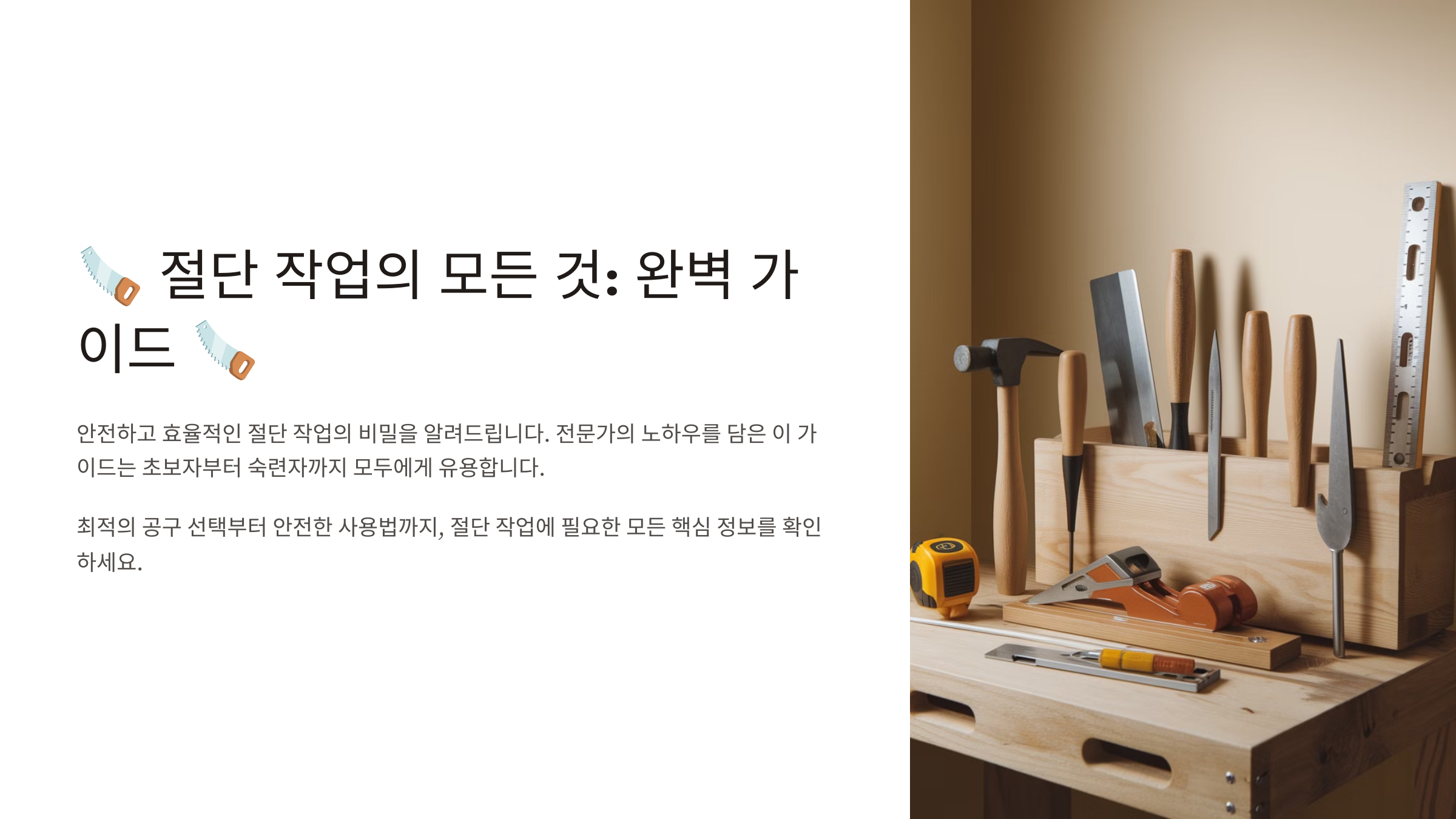 | 직선 절단 | 원형톱, 테이블쏘 | 빠르고 정교함 | 긴 자재 절단에 효율적 |