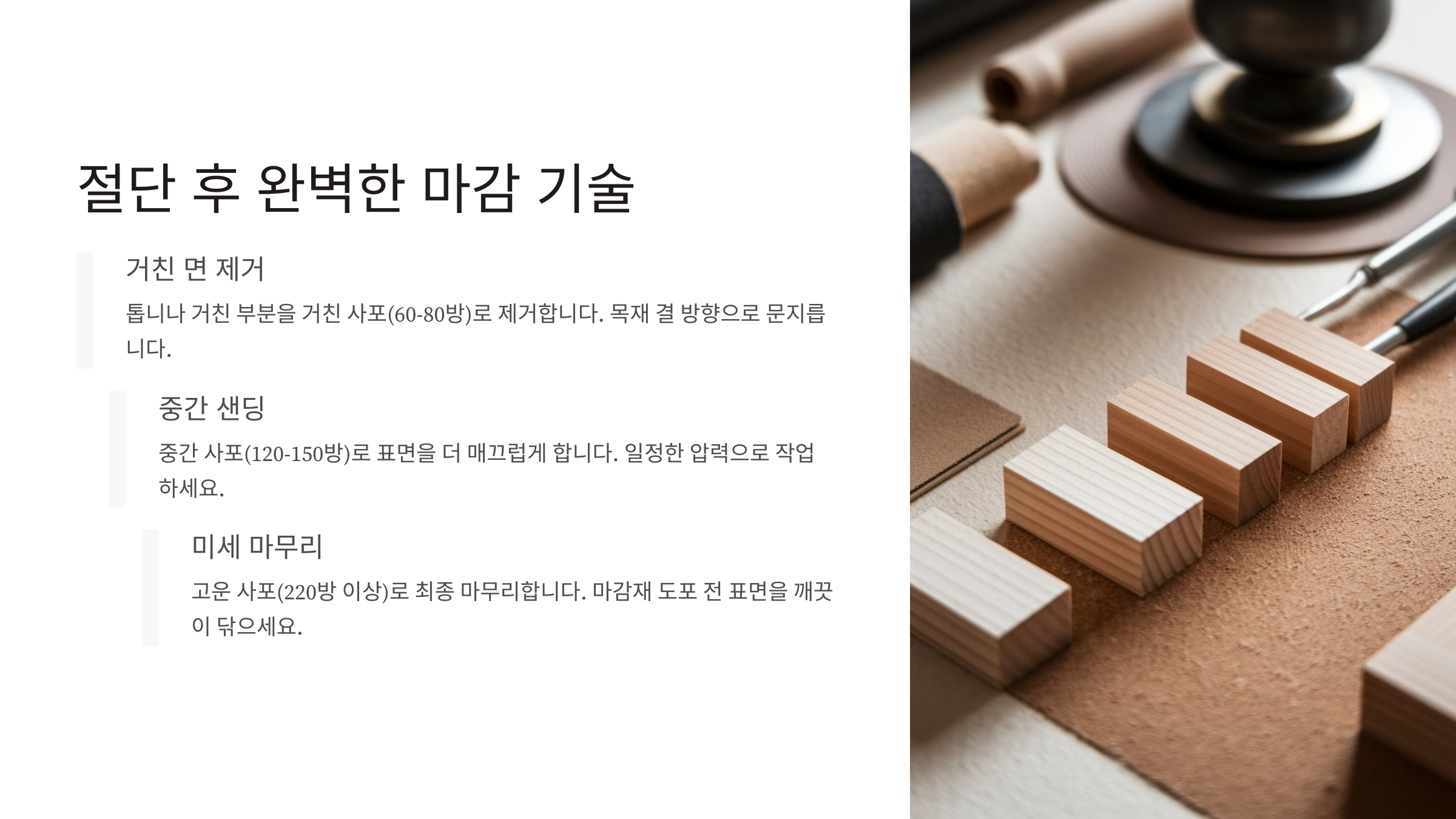 목재를 절단한 경우엔 먼저 사포나 샌더로 단면을 부드럽게 정리해요. 사포는 숫자가 낮을수록 거칠고, 높을수록 곱기 때문에 순서대로 사용하는 게 좋아요. 예를 들어 80번 → 120번 → 240번 이런 식으로 말이에요.