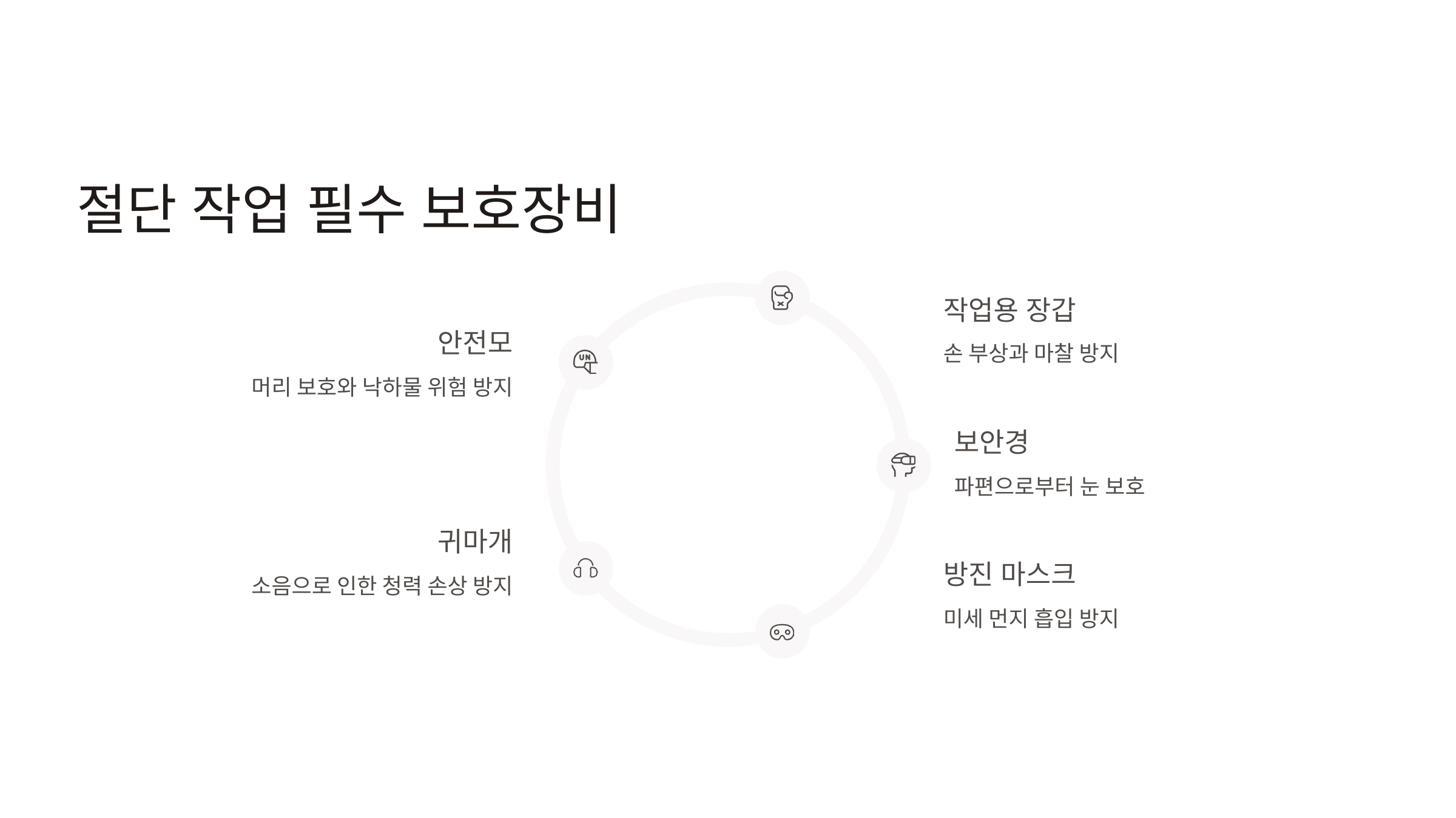 절단 작업은 언제나 위험 요소가 도사리고 있어요. 날카로운 절단면, 빠르게 회전하는 날, 튀는 파편과 먼지들… 그래서 절단 전에 반드시 보호장비를 착용해야 해요. 이건 선택이 아니라 필수예요!
