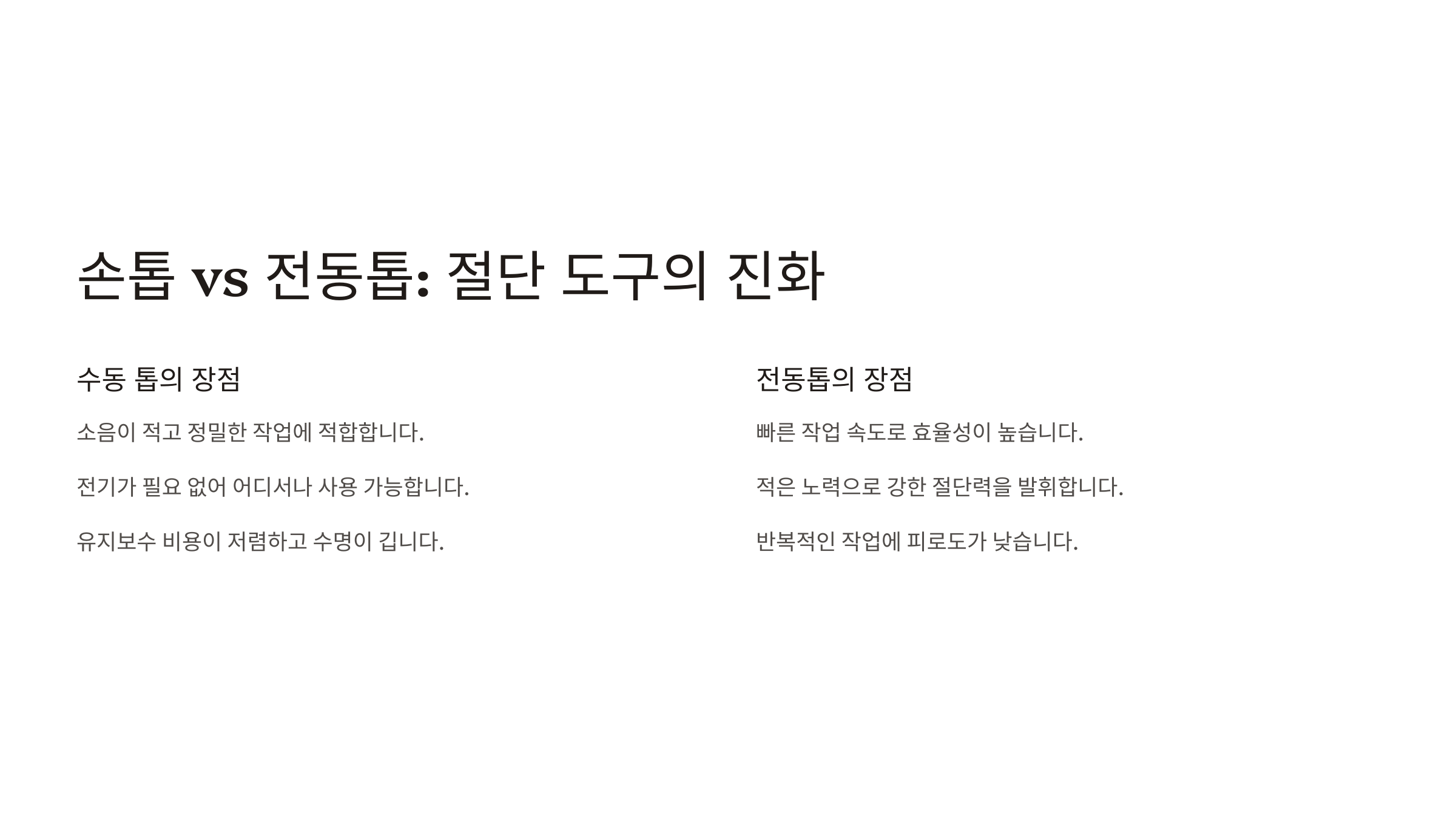 반면, 전동톱은 모터를 이용해 빠르게 절단하는 전기 공구예요. 목재뿐 아니라 금속이나 PVC 같은 단단한 재질도 쉽게 자를 수 있어요. 시간과 체력도 절약되고, 정밀도 역시 향상되기 때문에 요즘엔 전동톱 사용이 훨씬 많아졌어요.