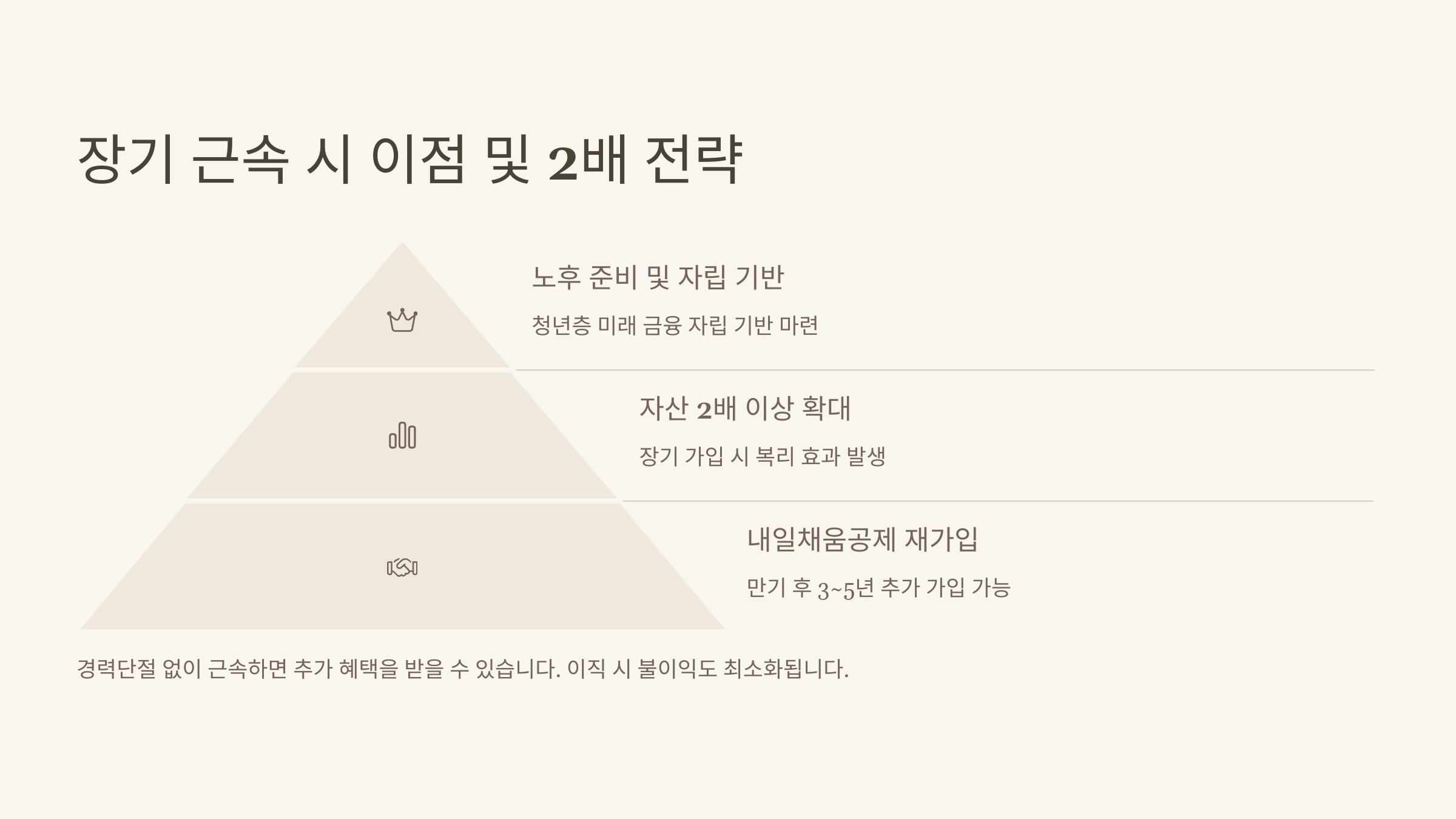 이 제도는 단순히 목돈만 만들어주는 것이 아니라, 장기 근속의 유인을 제공하는 데도 목적이 있어요. 2년 혹은 3년간 동일한 기업에 다니면서 일정 조건을 충족하면 전액을 수령할 수 있어요.