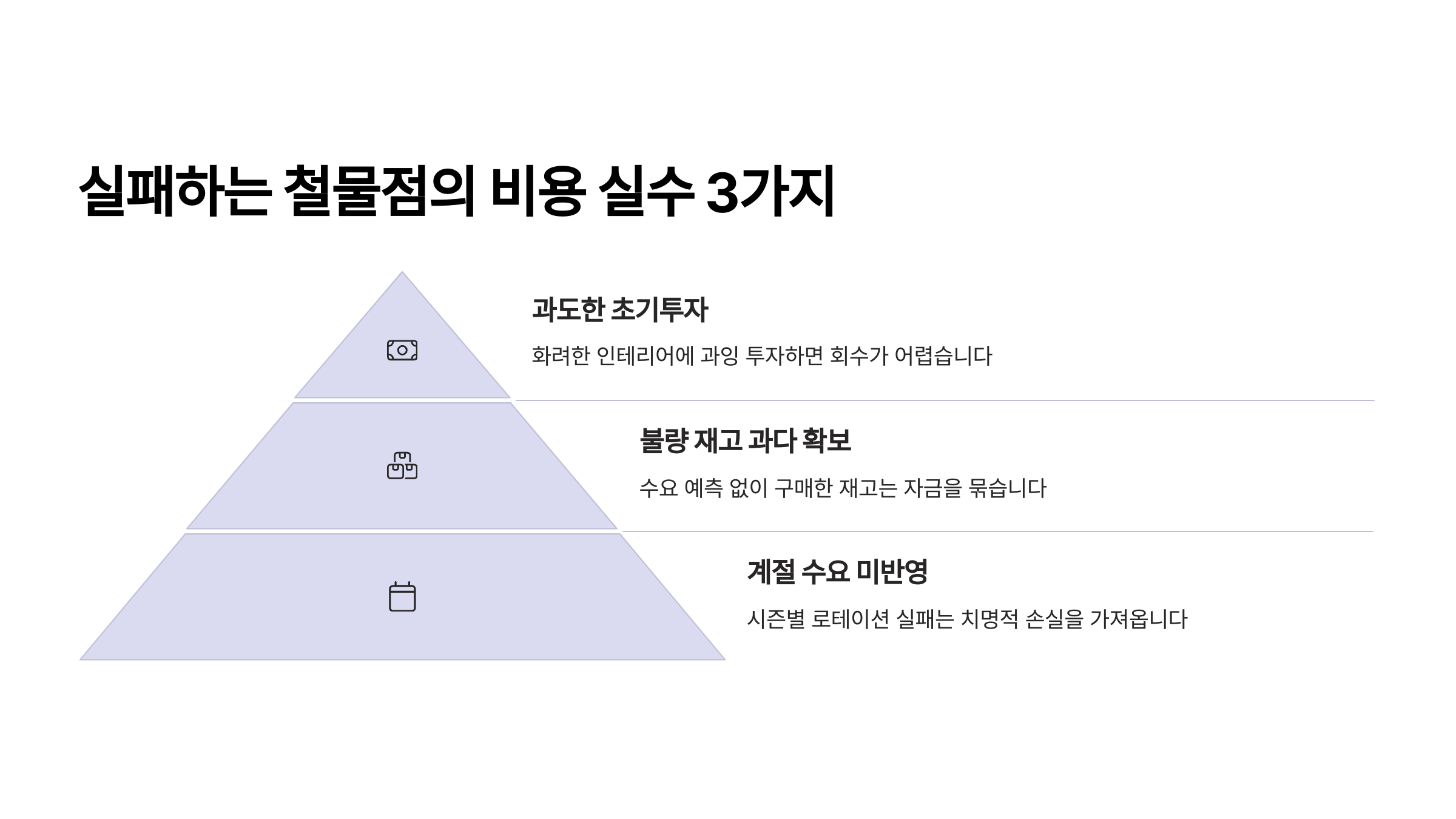 ์ด ์คํจํ๋ ๊ฐ์ฅ ํฐ ์ด์ ๋ โ๊ณผ์ ์ด๊ธฐ ํฌ์โ์์. ํนํ ๋งค์ฅ์ ๋๋ฌด ํฌ๊ฒ ์์ํ๊ฑฐ๋, ๊ณ ๊ฐ์ ์ฌ๊ณ ๋ฅผ ํ ๋ฒ์ ๋๋ ๊ตฌ๋งคํ๋ ๊ฒฝ์ฐ๊ฐ ๋ง์์. ์ด๊ธฐ์ ์ํ์ ์ฑ์ ๋ฃ๊ณ ์ถ์ ๋ง์์ ์ดํดํ์ง๋ง, ์ฒ ๋ฌผ์ ์ ํ์ ์จ์ด ์ค์ํ๋ค๋ ๊ฑธ ๊ผญ ๊ธฐ์ตํด์ผ ํด์.