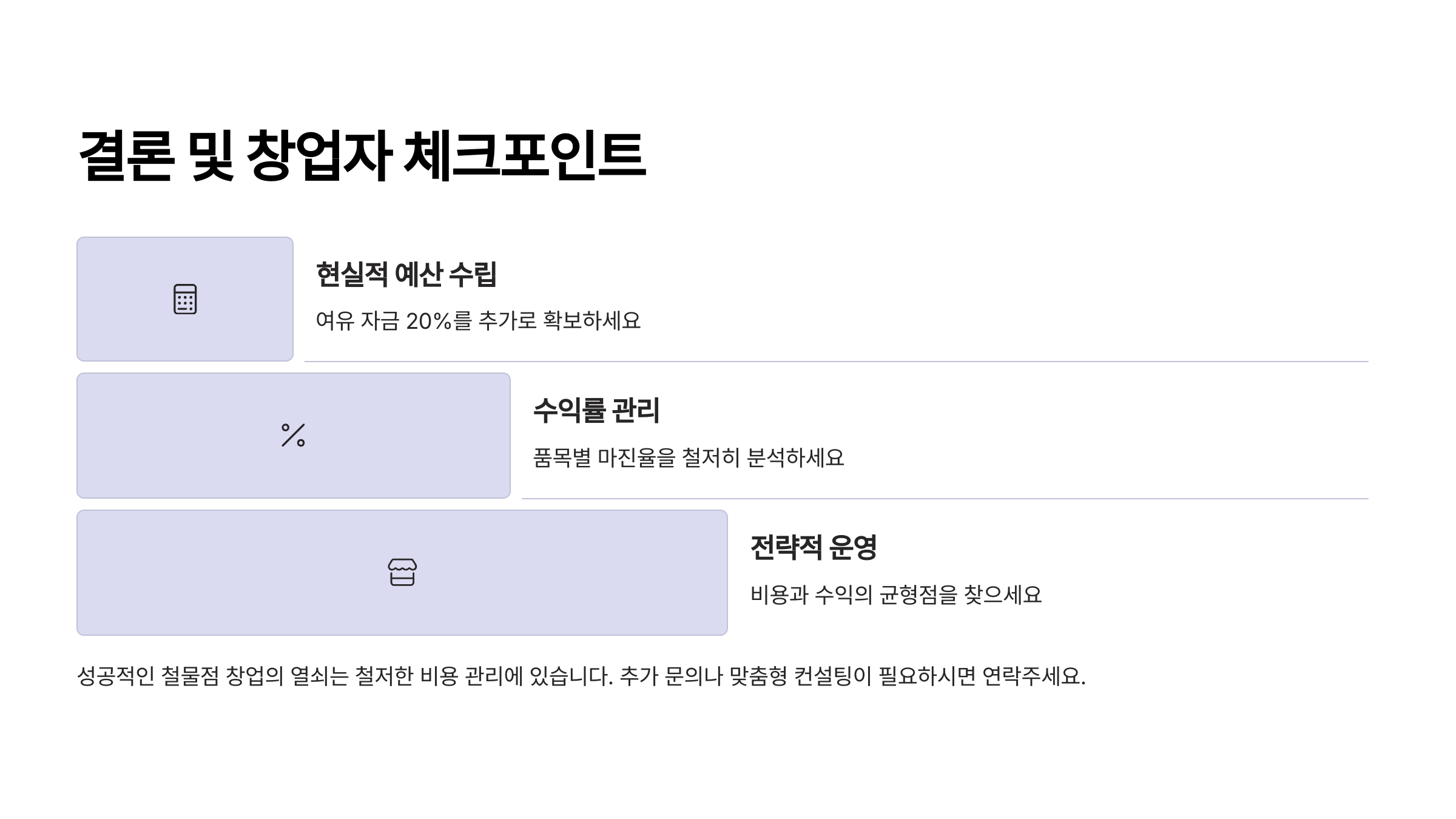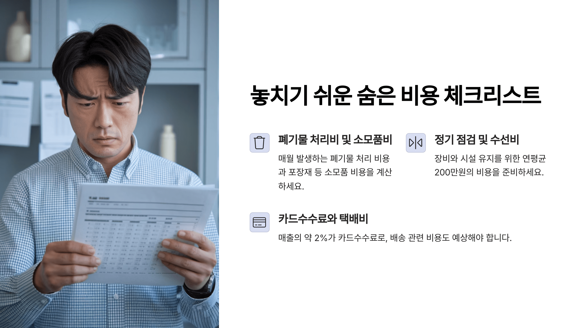 ๋ํ POS ์์คํ ๊ด๋ฆฌ๋น์ฉ, ์๋ชจํ ๊ตฌ๋งค๋น, ๊ณต๊ณผ๊ธ(์ ๊ธฐ์ธ, ์๋์ธ), ํ๊ธฐ๋ฌผ ์ฒ๋ฆฌ ๋น์ฉ๊น์ง ์ ๋ถ ํฌํจํด์ ์์ฐ์ ์ง์ผ ํด์. ์ฒ์์๋ ์์ํ ๊ธ์ก์ฒ๋ผ ๋๊ปด์ ธ๋, ๋์ ๋๋ฉด ๊ฝค ํฐ ๋ถ๋ด์ด ๋๊ฑฐ๋ ์.