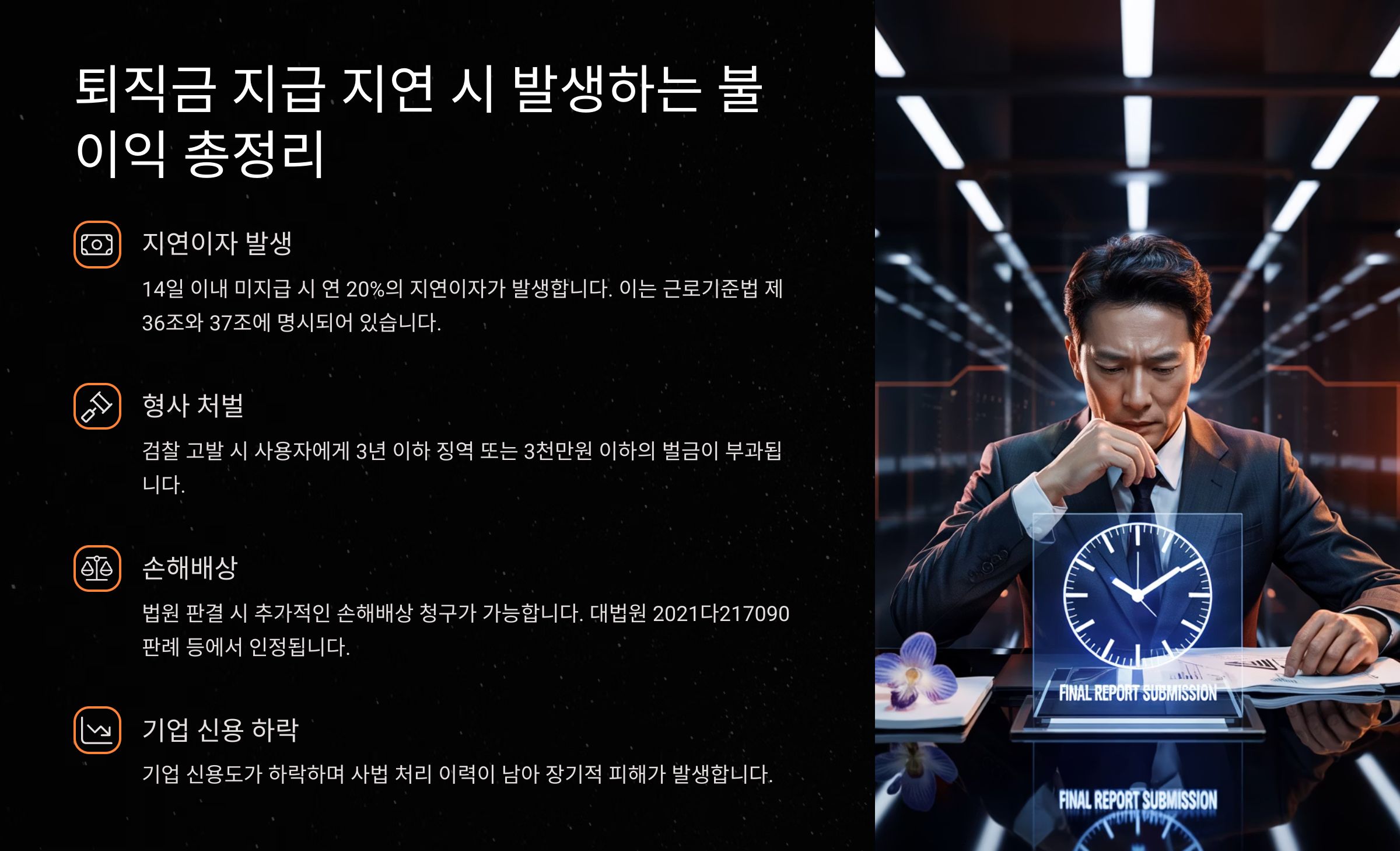 ์ฒซ ๋ฒ์งธ ๋ถ์ด์ต์ ๋ฐ๋ก **์ง์ฐ์ด์ ๋ถ๊ณผ**์์. ใ๊ทผ๋ก๊ธฐ์ค๋ฒใ ์ 36์กฐ์ ๋ฐ๋ฅด๋ฉด ํด์ง๊ธ์ ์ ํด์ง ๊ธฐ๊ฐ ๋ด ์ง๊ธํ์ง ์์ผ๋ฉด, ์ง์ฐ๋ ์ผ์์ ๋น๋กํด ์ฐ 20%์ ์ง์ฐ์ด์๋ฅผ ์ง๊ธํด์ผ ํด์. ์ด๋ ๊ทผ๋ก์์ ๊ฒฝ์ ์ ์ํด๋ฅผ ๋ณด์ ํ๊ธฐ ์ํ ๊ฐ๋ ฅํ ๋ฒ์ ์ฅ์น๋๋๋ค.