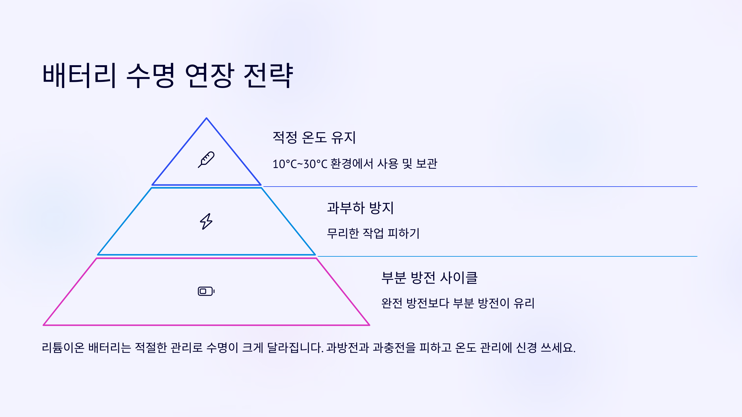 ๋จผ์ , ์์ถฉ๊ณผ ์๋ฐฉ(์์ ํ ์ถฉ์ ํ๊ฑฐ๋ ๋ฐฉ์ ํ๋ ๊ฒ)์ ํผํ๋ ๊ฒ ์ข์์. ๋ฆฌํฌ์ด์จ ๋ฐฐํฐ๋ฆฌ๋ ์ฝ 20~80% ์ฌ์ด๋ฅผ ์ ์งํ ๋ ๊ฐ์ฅ ์๋ช ์ด ๊ธธ์ด์ง๋ต๋๋ค. ๋งค๋ฒ 100%๊น์ง ์ถฉ์ ํ๊ฑฐ๋ 0%๊น์ง ์ฌ์ฉํ๋ ๊ฑด ๋ฐฐํฐ๋ฆฌ ์๋ช ์ ์ค์ด๋ ์ง๋ฆ๊ธธ์ด์์.