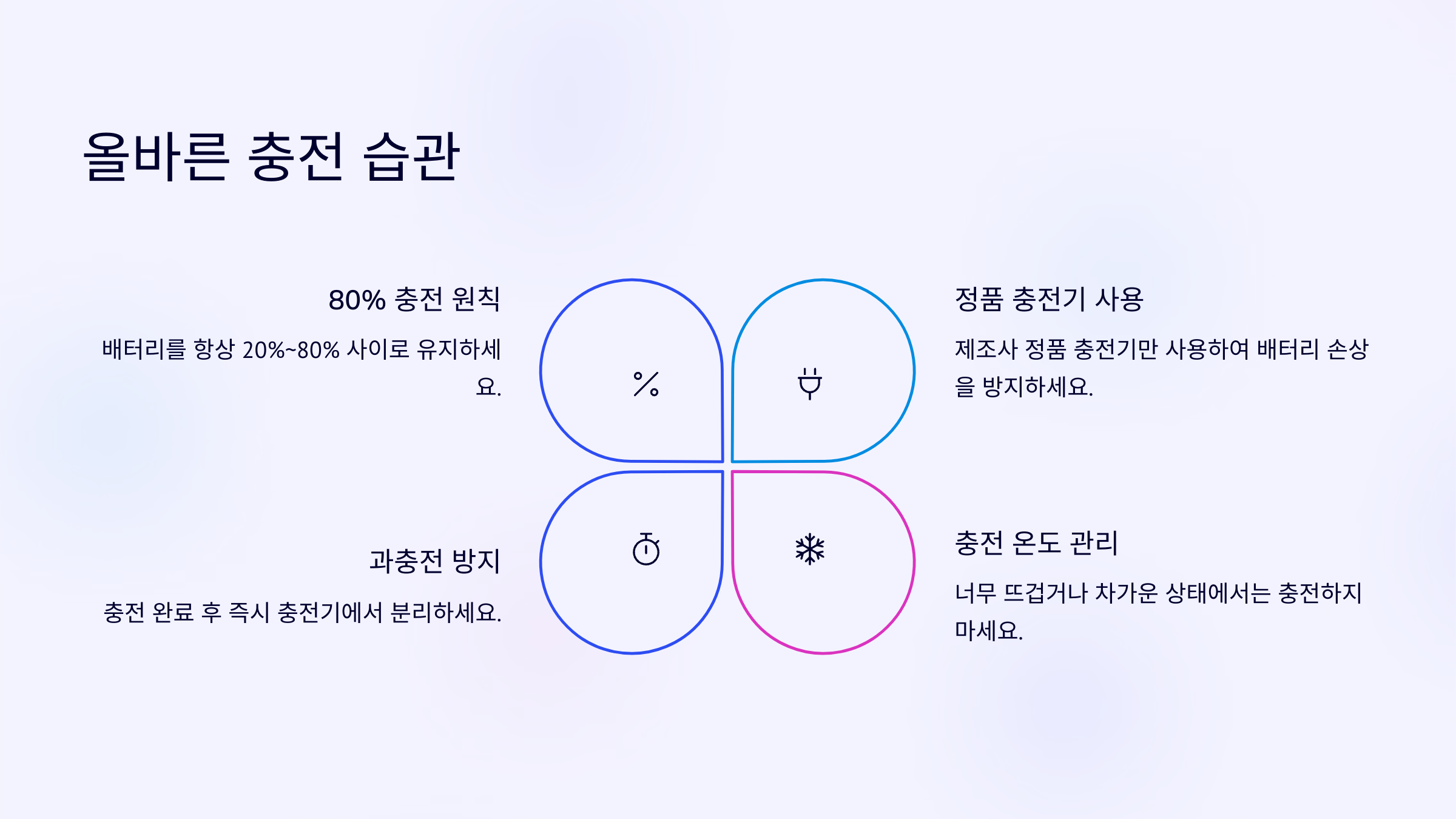 ์ถฉ์ ์ด ์๋ฃ๋๋ฉด ๋ฐ๋ก ํ๋ฌ๊ทธ๋ฅผ ๋นผ๋ ์ต๊ด๋ ์ค์ํด์. ๋ฌด์ ๋๋ผ์ด๋ฒ ๋๋ถ๋ถ์ ๊ณผ์ถฉ์ ๋ฐฉ์ง ํ๋ก๊ฐ ์๊ธด ํ์ง๋ง, ์ฅ์๊ฐ ๊ฝ์๋๋ ๊ฑด ๋ด๋ถ ์ ์ ์คํธ๋ ์ค๋ฅผ ์ค ์ ์์ด์. ์ถฉ์ ์๋ฃ ํ์๋ฑ์ด ๋ค์ด์ค๋ฉด ๋ฐ๋ก ๋นผ์ฃผ๋ ๊ฒ ์ข์์.