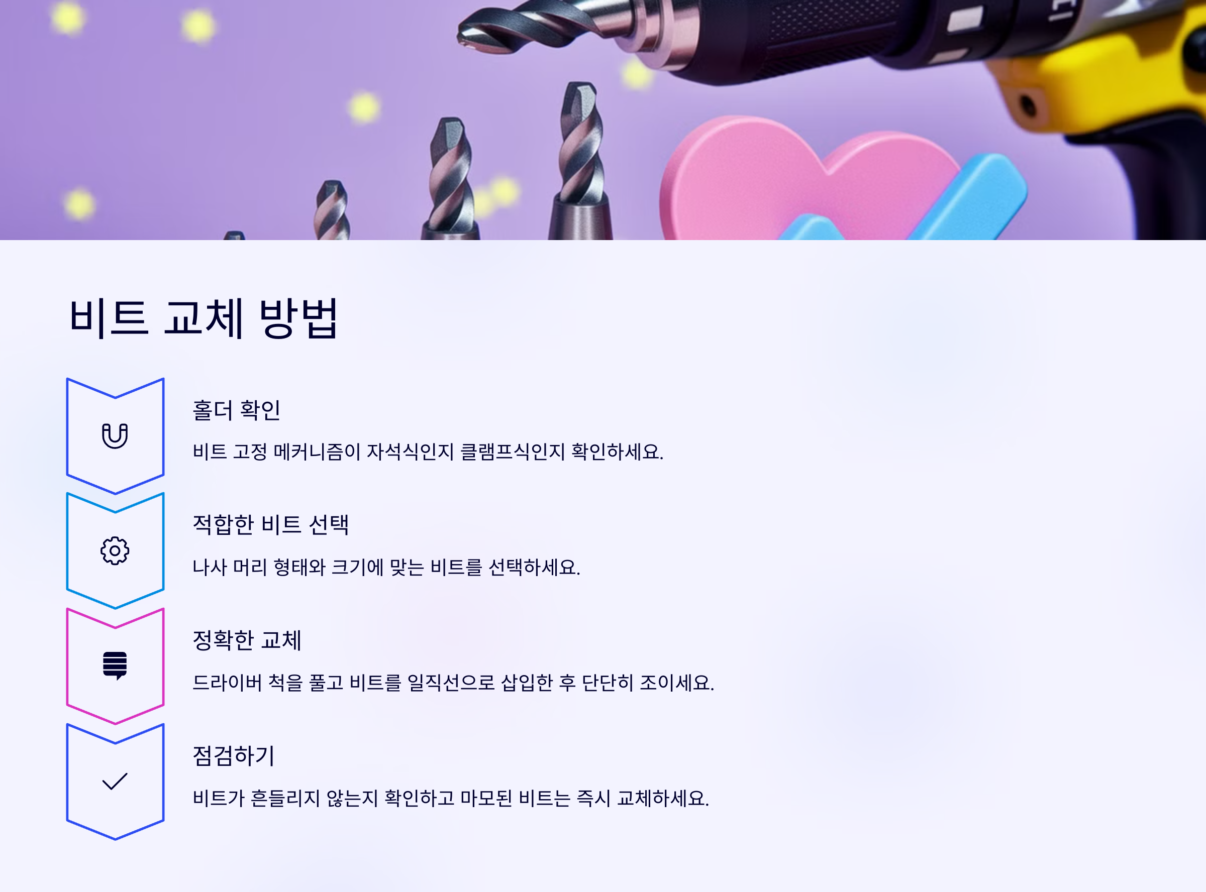 ๋นํธ๋ฅผ ๊ต์ฒดํ ๋๋ ์์ ์ด๋ฌผ์ง์ด ์๋๋ก ํ๊ณ , ๋นํธ์ ๋ง๋ชจ ์ํ๋ ํญ์ ์ฒดํฌํด ์ฃผ์ธ์. ๋ง๋ชจ๋ ๋นํธ๋ ๋์ฌ ๋จธ๋ฆฌ๋ฅผ ๋ง๊ฐ๋จ๋ฆฌ๊ฑฐ๋ ๋๋ผ์ด๋ฒ ๋ชจํฐ์ ๋ฌด๋ฆฌ๋ฅผ ์ค ์ ์์ด์. ๋นํธ ๊ต์ฒด๋ ๋จ์ํด ๋ณด์ฌ๋ ์ธ์ฌํจ์ด ํ์ํ ์์ ์ด์์ ๐