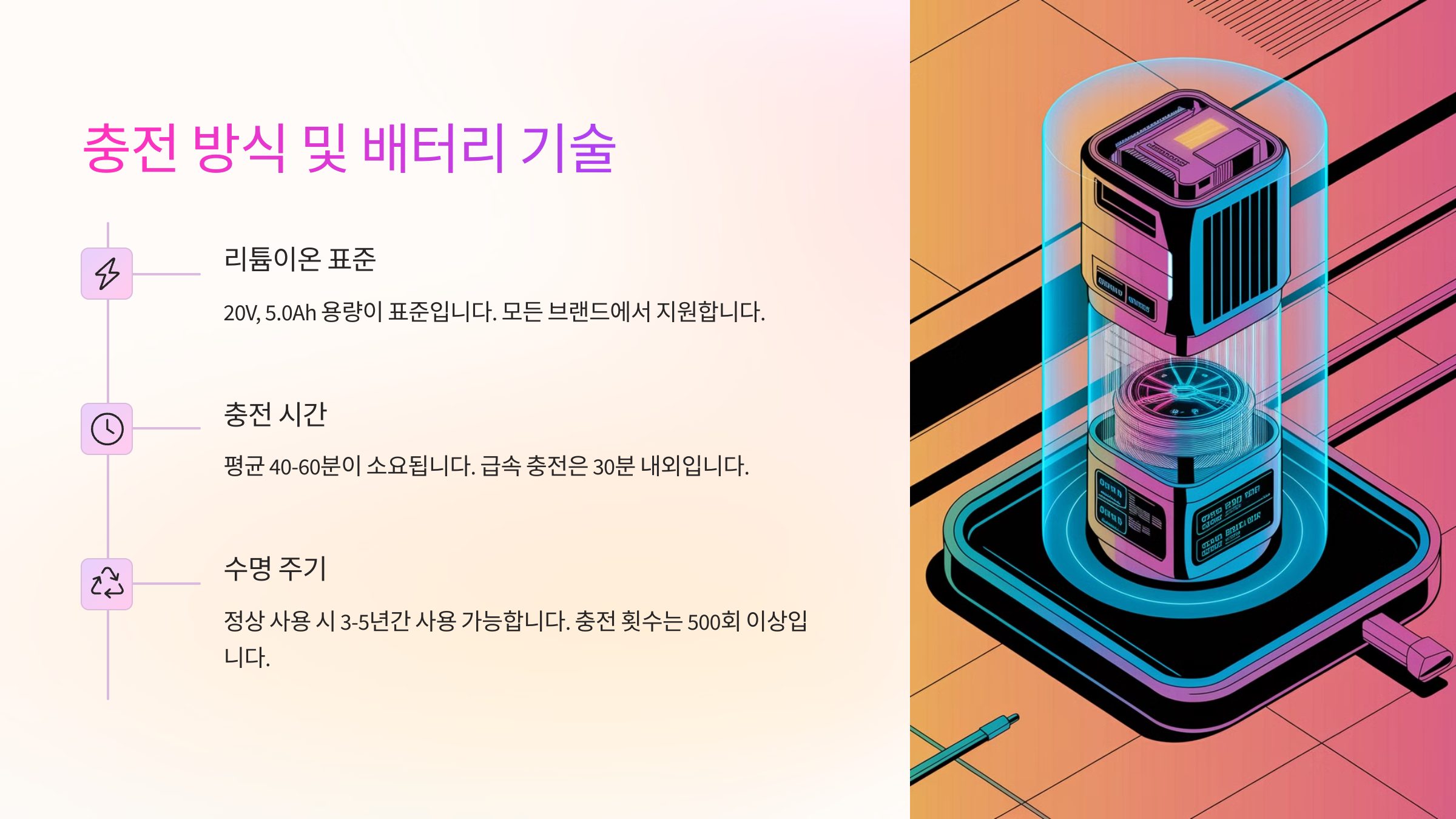ํ์ฌ ๋๋ถ๋ถ์ ์ ๋๊ณต๊ตฌ๋ ๋ฆฌํฌ์ด์จ(Li-ion) ๋ฐฐํฐ๋ฆฌ๋ฅผ ์ฌ์ฉํ๊ณ ์์ด์. ๋ฌด๊ฒ๊ฐ ๊ฐ๋ณ๊ณ , ์ถฉ์ ์๋๋ ๋น ๋ฅด๊ณ , ๋ฉ๋ชจ๋ฆฌ ํจ๊ณผ๊ฐ ์์ด์ ๋ฐฐํฐ๋ฆฌ ์ฑ๋ฅ ์ ํ๊ฐ ๋ํ์ฃ . ์ค๋ ์ฐ๊ณ ์ถ๋ค๋ฉด ๋ฆฌํฌ์ด์จ ๋ฐฐํฐ๋ฆฌ๊ฐ ๊ธฐ๋ณธ์ด์์. ๐ชซ