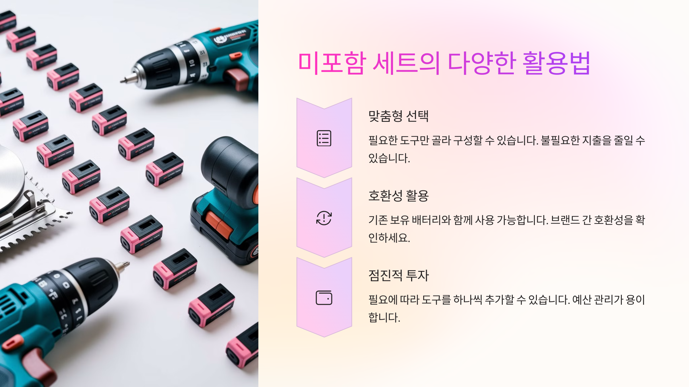 ์๋ฅผ ๋ค์ด, ๋งํคํ๋ ๋์ํธ ๊ฐ์ ๋ธ๋๋๋ ๋ฐฐํฐ๋ฆฌ ์์คํ ์ด ํตํฉ๋์ด ์์ด์ ๋ฐฐํฐ๋ฆฌ๋ง ํ๋ ์์ผ๋ฉด ๋ค์ํ ๊ณต๊ตฌ์ ํจ๊ป ์ฌ์ฉํ ์ ์์ด์. ๋ฏธํฌํจ ์ธํธ๋ ๋ฐ๋ก ์ด๋ฐ ์ ์ ํ์ฉํ๋ ์ ๋ต์ ์ธ ์๋น ๋ฐฉ๋ฒ์ด์์. โ๏ธ