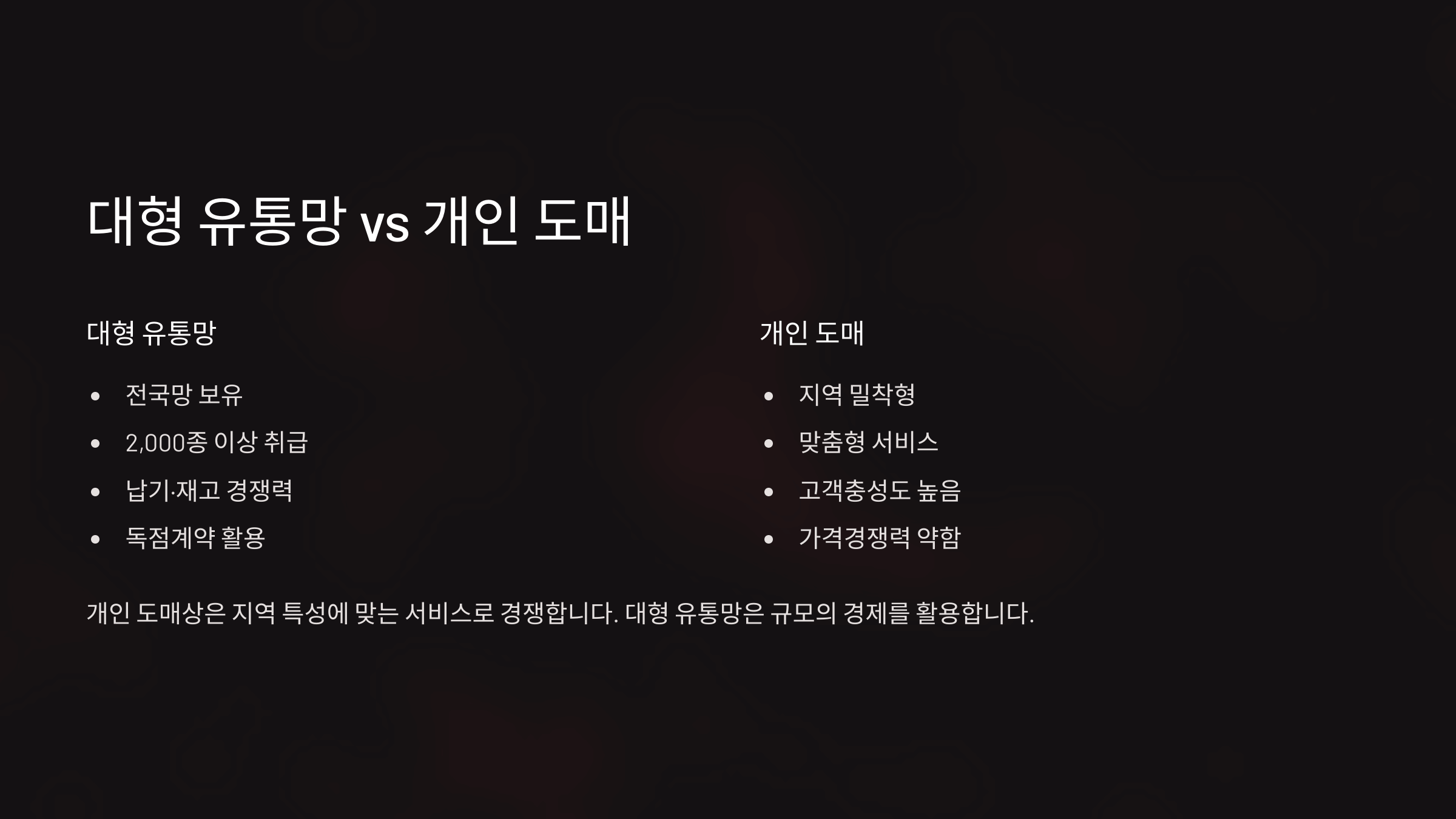 ๊ณต๊ตฌ ์์ฅ์์๋ ๋ํ ์ ํต๋ง๊ณผ ๊ฐ์ธ ๋๋งค์ ๊ฐ์ ๊ฒฝ์์ ์น์ดํด์. ๋ํ ์ ํต๋ง์ ์ ๊ตญ์ ์ผ๋ก ๋ฌผ๋ฅ๋ฅผ ๊ด๋ฆฌํ๊ณ , ์์คํ ํ๋ ๊ณต๊ธ๋ง์ ํตํด ๋๋ ๊ตฌ๋งค์ ์ ๊ฐ ๊ณต๊ธ์ด ๊ฐ๋ฅํด์. ์๋ฅผ ๋ค์ด ๋ํ ์ฒ ๋ฌผ ์ ๋ฌธ ์ฒด์ธ์ ์ด๋ ๊ธ๋ก๋ฒ ๋ธ๋๋์ ๊ณต์ ๋๋ฆฌ์ ์ด ์ฌ๊ธฐ์ ์ํด์.