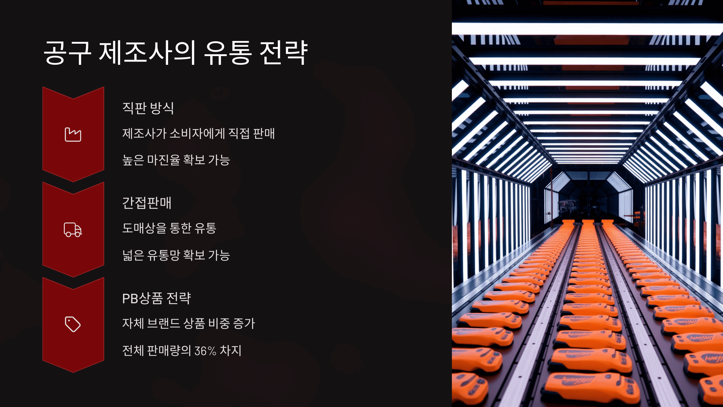 ๊ณต๊ตฌ ์ ์กฐ์ฌ๋ค์ ์ ํ์ ๊ฐ๋ฐํ๊ณ ์์ฐํ ๋ค ์ง์ ํ๋งคํ๊ฑฐ๋, ๋๋งค์ ๋ฐ ์ ํต ํํธ๋๋ฅผ ํตํด ์ ํ์ ์์ฅ์ ๊ณต๊ธํด์. ์ฌ๊ธฐ์ ๊ฐ์ฅ ์ค์ํ ์ ๋ต ์ค ํ๋๋ โ๋จ๋ ์ ํตโ๊ณผ โ๋ณต์ ์ ํตโ์ ์ ํ์ด์์. ๋จ๋ ์ ํต์ ํน์ ๋๋งค์์๋ง ๋ ์ ์ ์ผ๋ก ๊ณต๊ธํ์ฌ ๋ธ๋๋ ํต์ ๋ ฅ์ ๊ฐํํ๊ณ , ๊ฐ๊ฒฉ ๊ฒฝ์์ ์ค์ด๋ ๋ฐฉ์์ด์์.