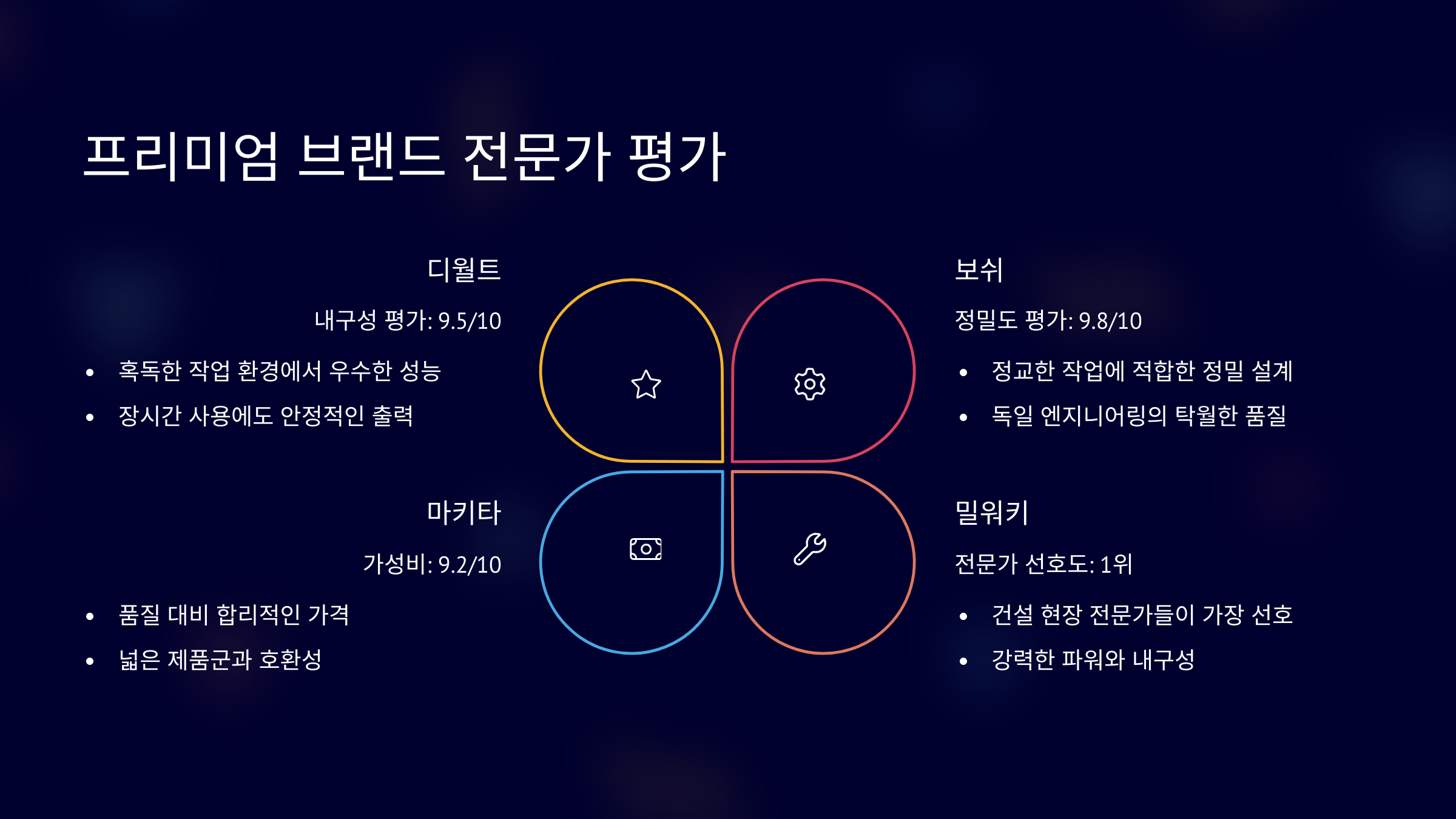 ๊ธฐ์ค์ผ๋ก ์ ๋ฌธ๊ฐ๋ค ์ฌ์ด์์ ๋์ ํ๊ฐ๋ฅผ ๋ฐ๊ณ ์๋ ๋ธ๋๋๋ Hilti, Festool, Milwaukee, Bosch Professional ์๋ฆฌ์ฆ์์.