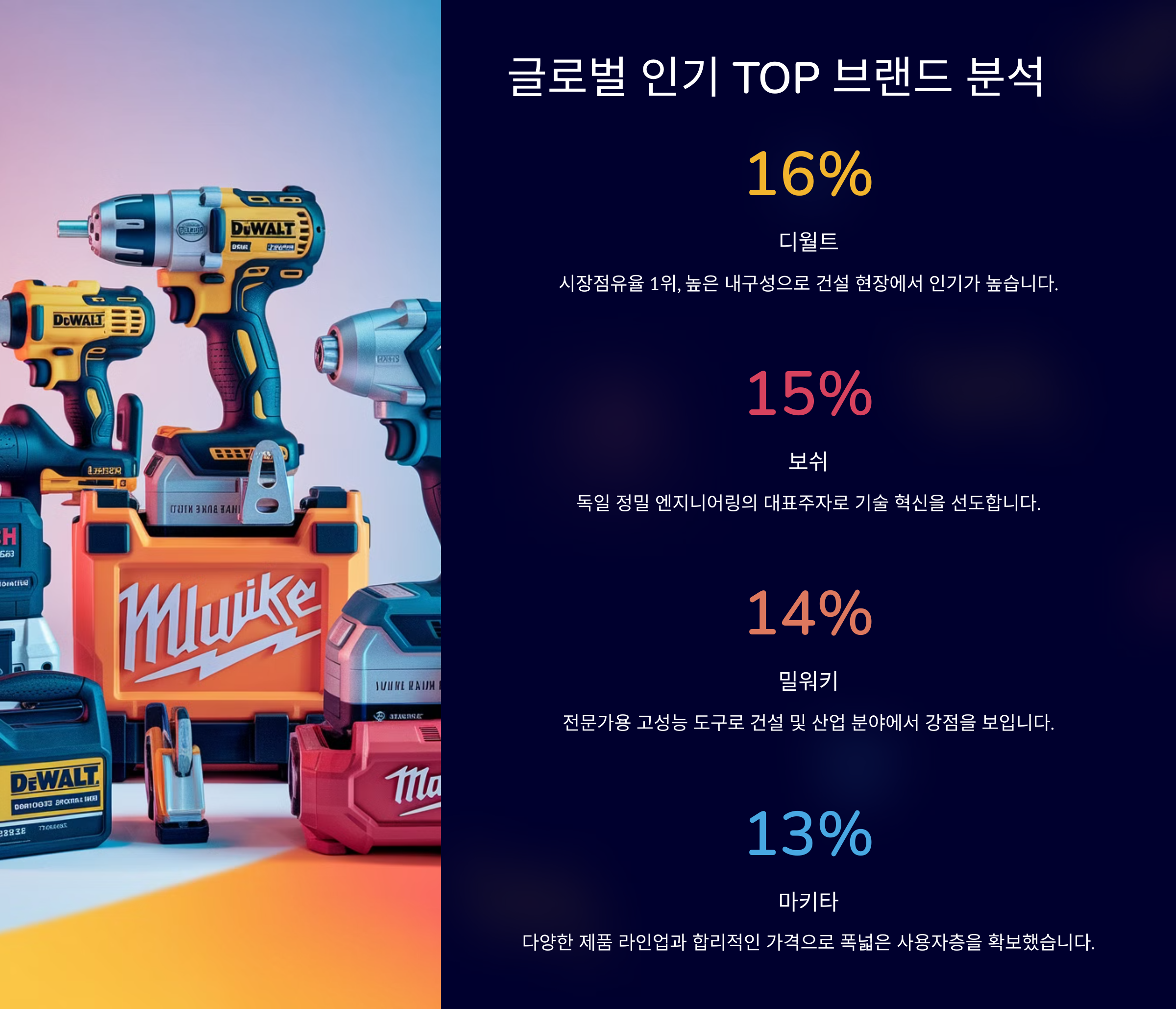 ์ธ๊ณ ์์ฅ์์ ๊พธ์คํ ์ฌ๋๋ฐ๊ณ ์๋ ์ ๋๊ณต๊ตฌ ๋ธ๋๋๋ค์ ์ดํด๋ณด๋ฉด, ๋ช๋ช ์ด๋ฆ๋ค์ด ๋จ์ฐ ๋์ ๋์ด์. ๊ทธ์ค์์๋ DEWALT, Makita, Bosch, Milwaukee, Hilti๋ 2025๋