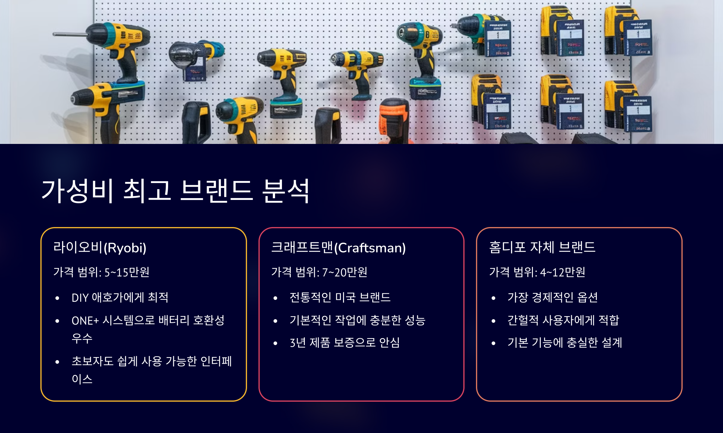 ์ ๋ฌธ๊ฐ์ DIY ์ ์ ๋ชจ๋์๊ฒ ๋ง์ถคํ ๊ณต๊ตฌ๊ฐ ํ์ํด์ง๋ฉด์, ๋ธ๋๋๋ณ ํน์ง๊ณผ ์ฅ๋จ์ ์ ๋น๊ตํ๋ ์ผ์ด ๊ทธ ์ด๋ ๋๋ณด๋ค ์ค์ํด์ก์ด์. ์ง๊ธ๋ถํฐ๋ ์์ฅ์ ์ฃผ๋ํ๋ ๊ธ๋ก๋ฒ ๋ธ๋๋๋ถํฐ, ๊ฐ์ฑ๋น๋ฅผ ์ค์ํ๋ ์ฌ์ฉ์, ์ ๋ฌธ์์๊ฒ ๋ฑ ์ข์ ์ ํ๊น์ง ๊ผผ๊ผผํ ์ดํด๋ณผ๊ฒ์. ๋ธ๋๋ ์ ํ์ ๋์์ด ๋๋ ์ค์ง์ ์ธ ์ ๋ณด๋ฅผ ์์ ๋ชจ์์ผ๋๊น ๋๊น์ง ์ฝ์ด๋ณด๋ฉด ํฐ ๋์ ๋ ๊ฑฐ์์!