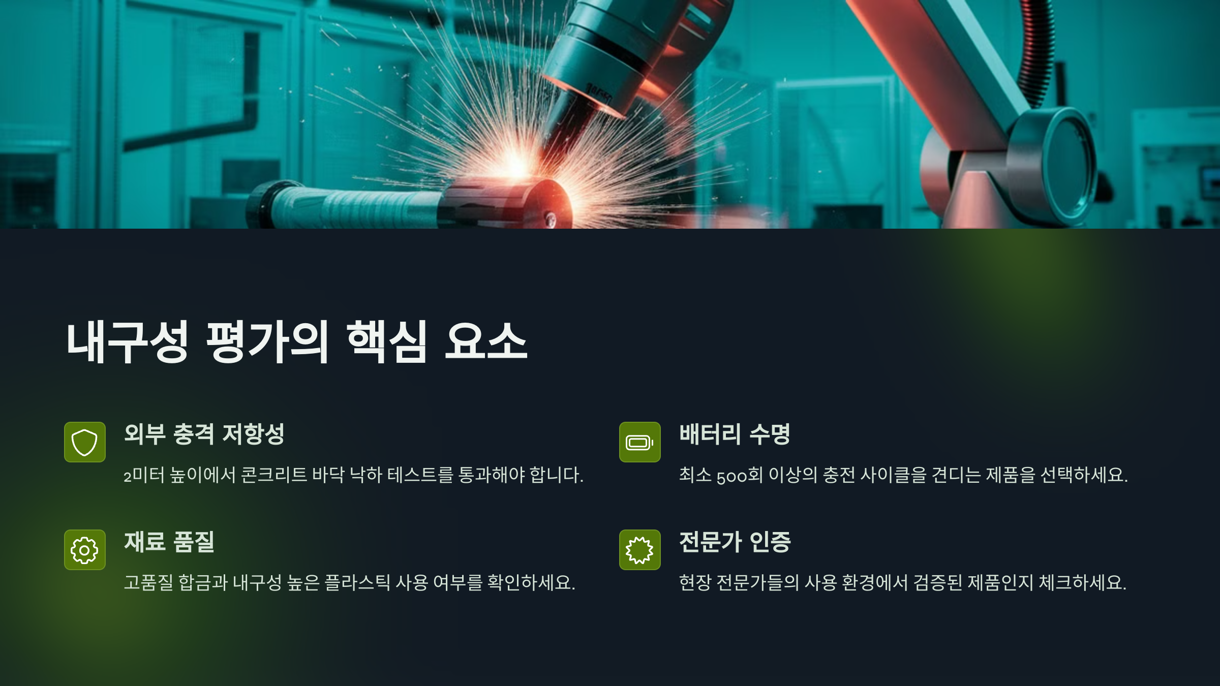 ์ ๋๊ณต๊ตฌ๋ ์์ฃผ ๋จ์ด๋จ๋ฆฌ๊ฑฐ๋ ์ถฉ๊ฒฉ์ด ๊ฐํด์ง๋ ํ๊ฒฝ์์ ๋ง์ด ์ฌ์ฉ๋ผ์. ๊ทธ๋์ ์ ํ ์ ํ ์, ์ธ๋ถ ์ถฉ๊ฒฉ์ ๊ฐํ ๋ชจ๋ธ์ธ์ง ๊ผญ ์ฒดํฌํด์ผ ํด์. ๋ํ์ ์ผ๋ก โ๋ธ๋ฌ์๋ฆฌ์ค ๋ชจํฐโ๋ฅผ ์ฌ์ฉํ ์ ํ๋ค์ด ๋ ํผํผํ ๊ฒฝ์ฐ๊ฐ ๋ง๊ณ , ๋ด๋ถ ๋ถํ๋ ๋ด์ด์ฑ๊ณผ ๋ด์ถฉ๊ฒฉ์ฑ์ด ๋๊ฒ ์ค๊ณ๋์ด ์์ด์.