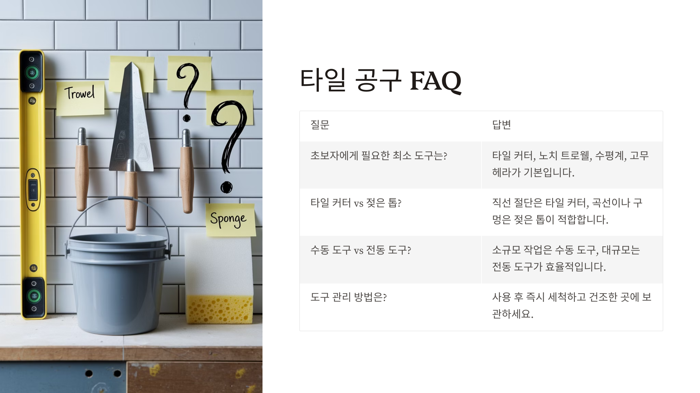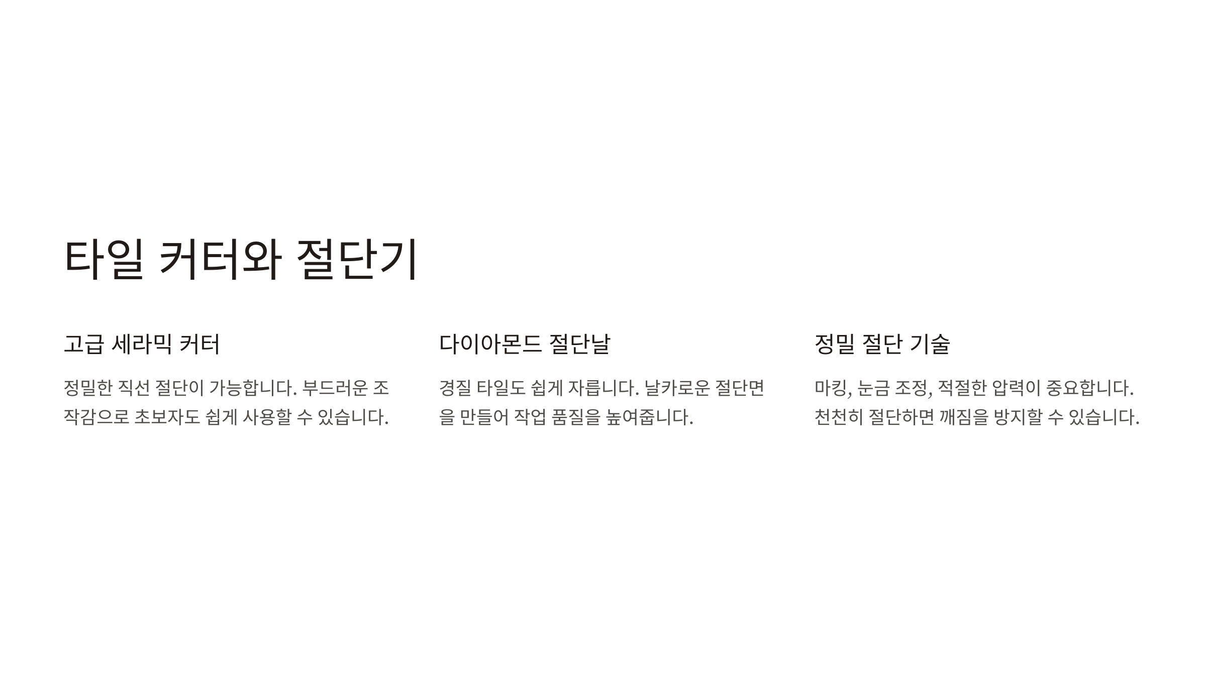 ์ ๋ฆฌํ์๋ฉด, ํ์ผ์ ์ข ๋ฅ์ ์๊ณต ๋ถ์์ ๋ฐ๋ผ ์ ์ ํ ์ ๋จ ๋๊ตฌ๋ฅผ ์ ํํ๋ ๊ฒ ์ค์ํด์. ์ง์์ ์์ค์ด๋ ์ฃผ๋ฐฉ ๋ฒฝ ํ์ผ ์ ๋๋ผ๋ฉด ์๋ ์ปคํฐ๋ก๋ ์ถฉ๋ถํ๊ณ , ๋ฐ๋ฅ์ด๋ ์ธ๋ฒฝ ํ์ผ์ฒ๋ผ ๋์ ๋ฉด์ ์ ์๊ณตํ ๋ ์ ๋ ์ ๋จ๊ธฐ๋ฅผ ์ฐ๋ ๊ฒ ํจ์ฌ ํจ์จ์ ์ด์์!