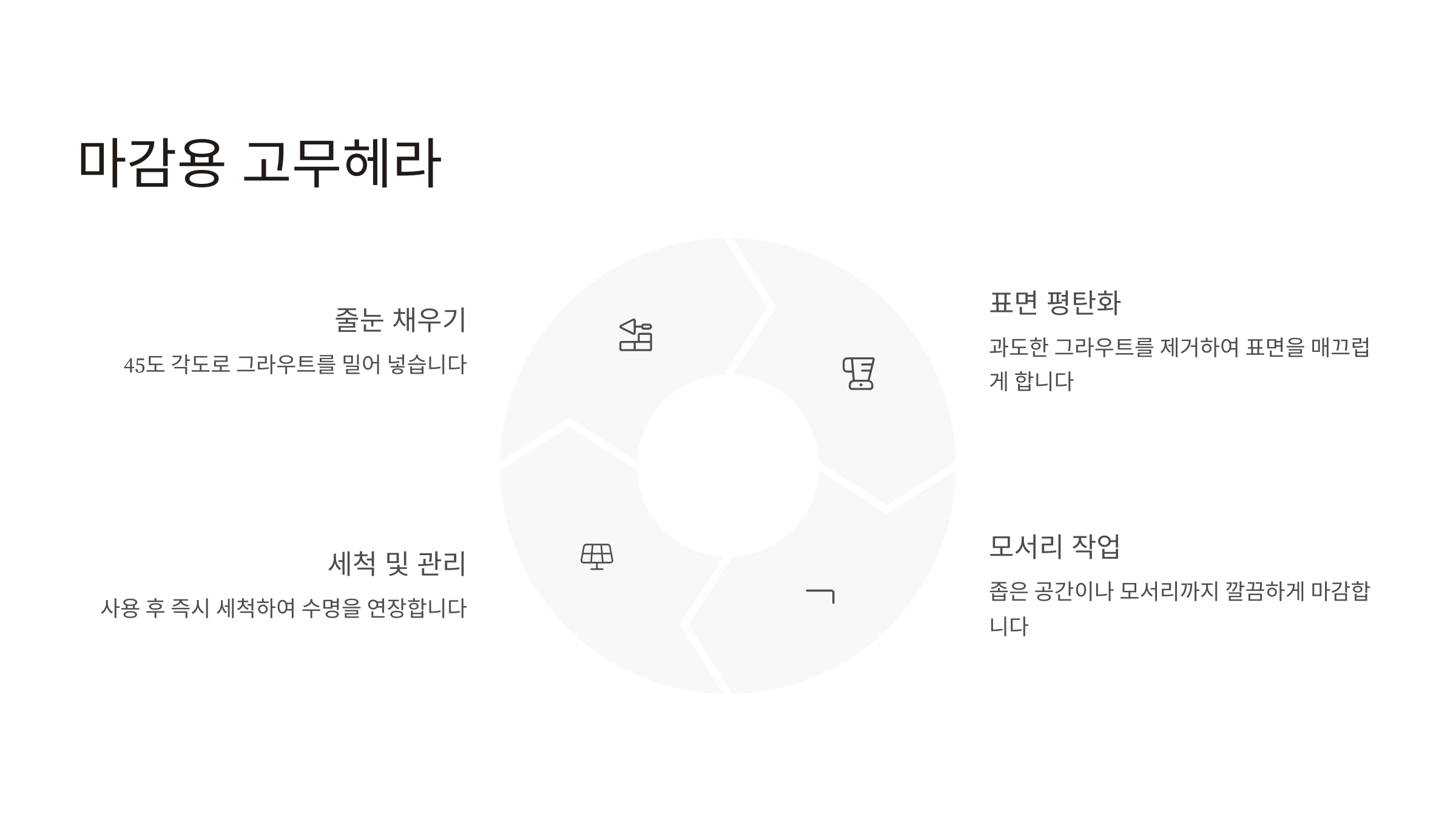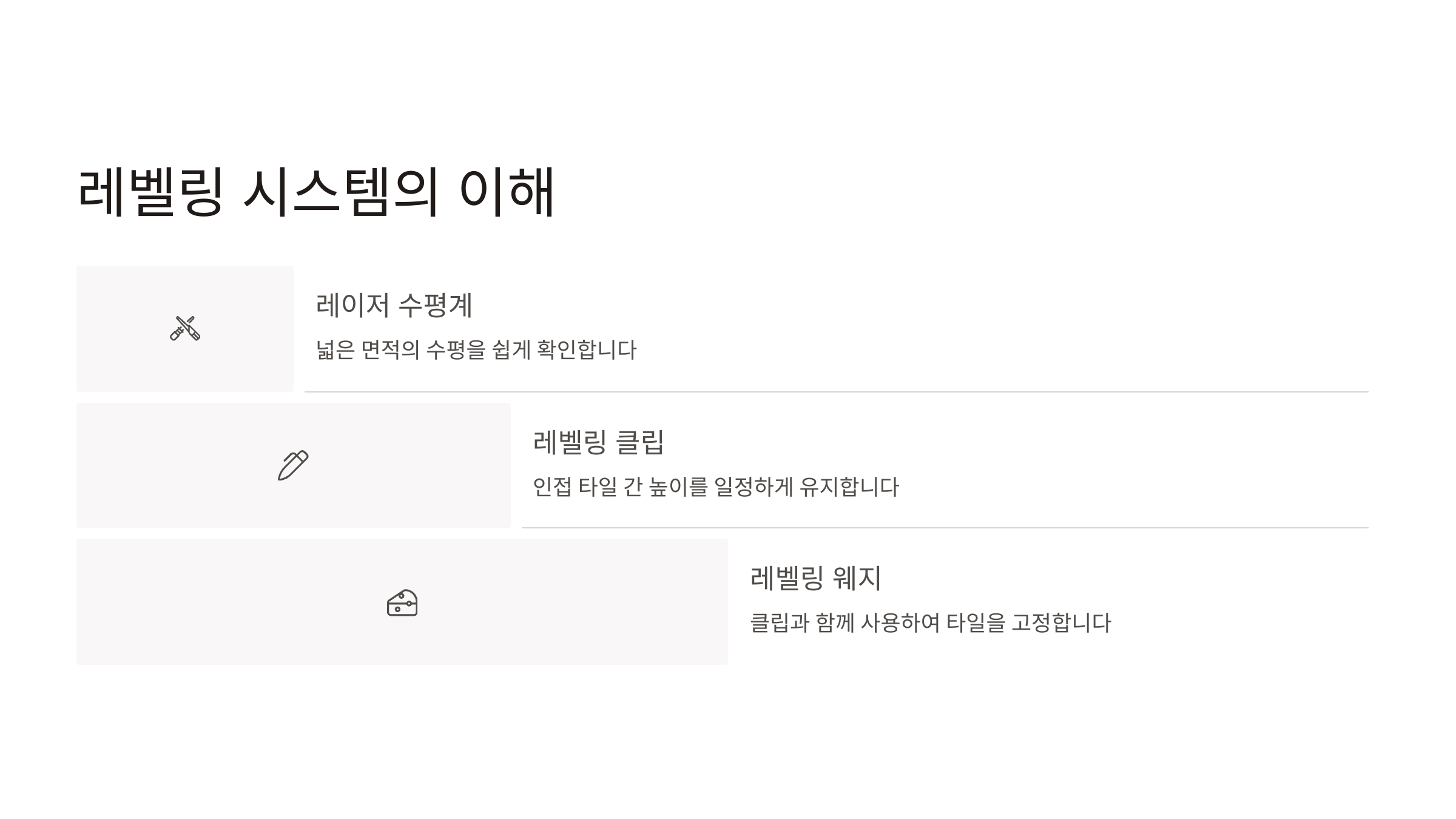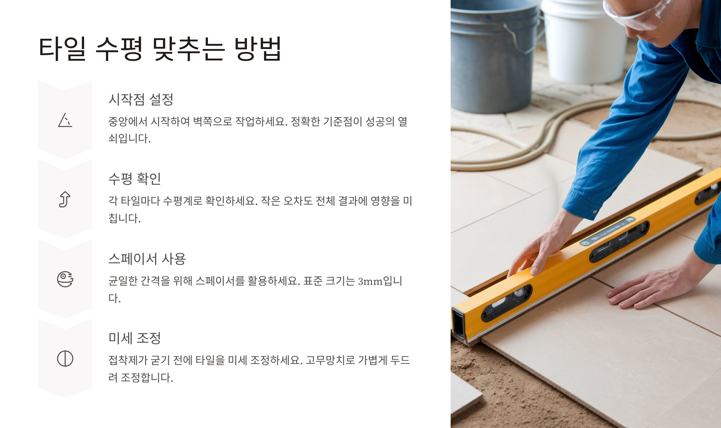 ๋ฐ๋ฅ ํ์ผ ์์ ์์๋ ๊ณ ๋ฌด๋ง์น๋ ์ค์ํด์. ํ์ผ์ ์ ์๋ฆฌ์ ๋๊ณ ๊ฐ๋ณ๊ฒ ๋๋๋ ค์ ๋๋ฎ์ด๋ฅผ ์กฐ์ ํ ์ ์๋๋ฐ, ์ด๋ ๋๋ฌด ์ธ๊ฒ ์น๋ฉด ํ์ผ์ด ๊นจ์ง ์ ์์ผ๋ ์กฐ์ฌํด์ผ ํด์. ๋, ํ์ผ ์์ ์ ๋ฐ๋ฅ์ ์ ํ ๋ ๋ฒจ๋ง์ ๋ฅผ ์ฌ์ฉํ๋ ๊ฒ๋ ๊ณ ๋ฅด์ง ์์ ๋ฐ๋ฅ์ ํํํ๊ฒ ๋ง๋๋ ๋ฐ ํจ๊ณผ์ ์ด์์.