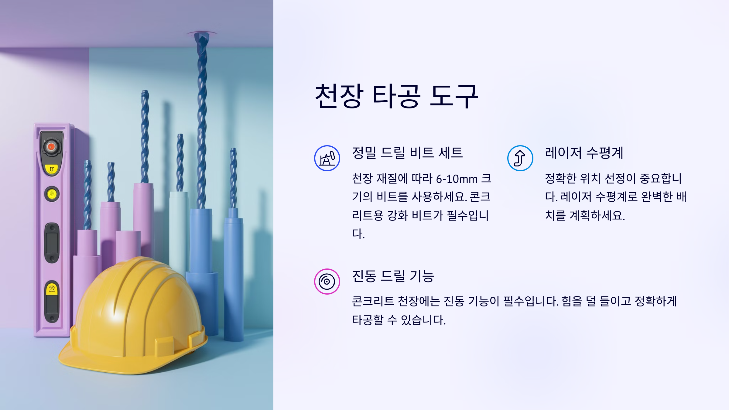์์ ์ฒ์ฅ ํ๊ณต์ ๊ธฐ๋ณธ ์ค์ ๊ธฐ๋ณธ์ด์์. ํนํ ๋ค์ด๋ผ์ดํธ, ํ๋ํธ ๋ฑ์ ์ค์นํ ๋ ์ฒ์ฅ์ ์ ํํ๊ฒ ์ ๋จํ๋ ์์