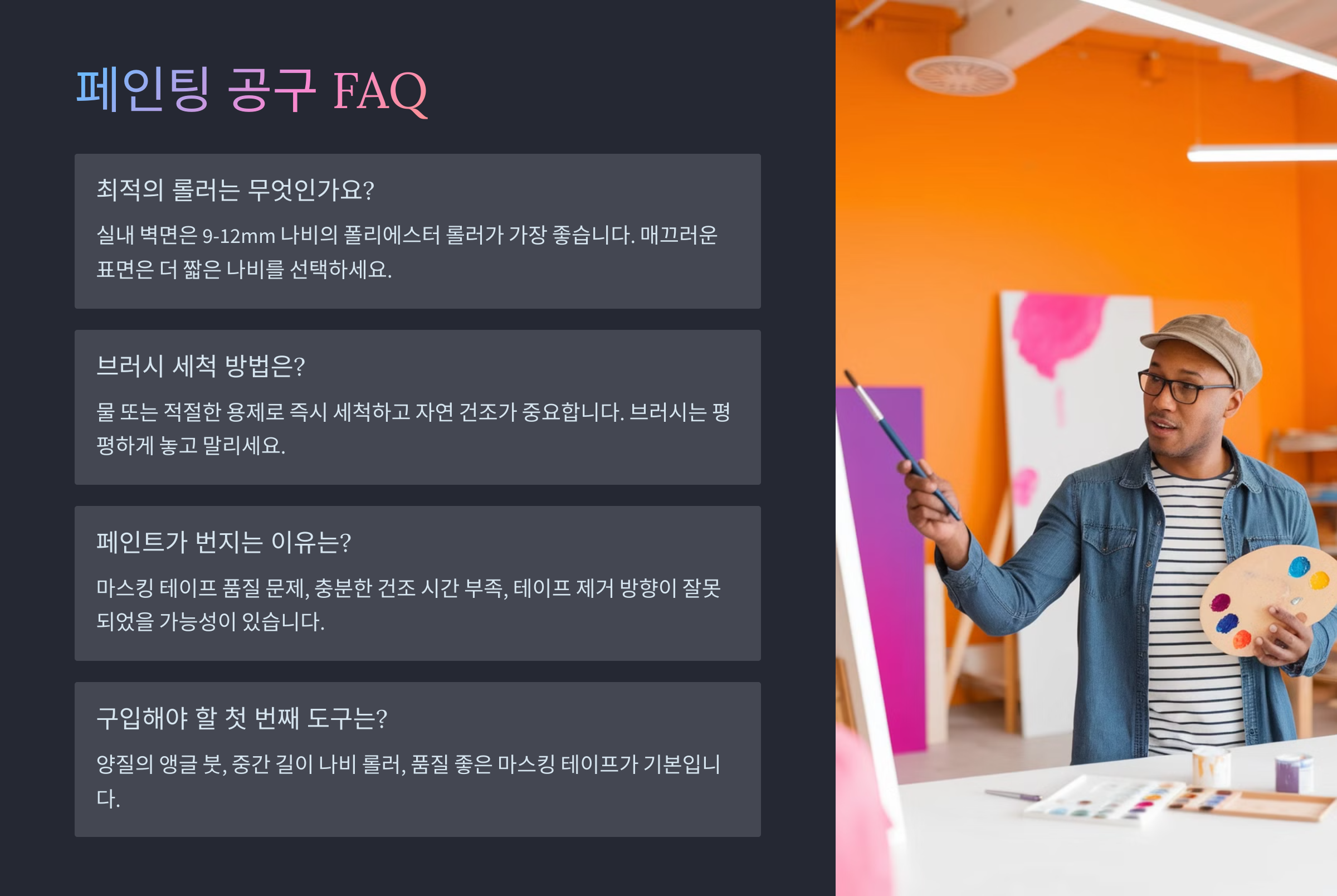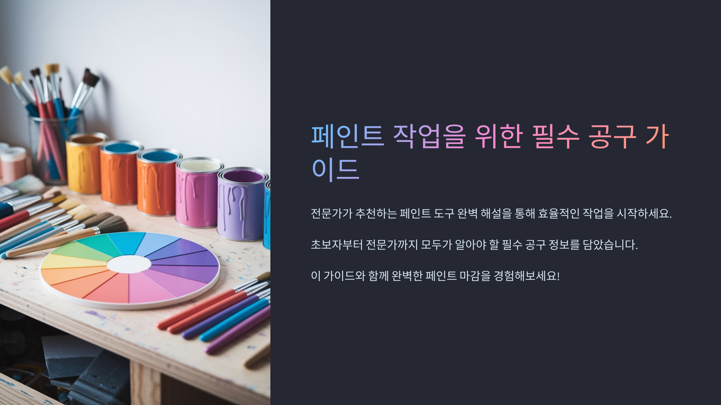 ์ง์์ ์ ํ๋ก ๋ฒฝ์ ์น ํด๋ณด๋ ค๊ณ ํ ๋, ์ด๋ค ๊ณต๊ตฌ๋ฅผ ์ค๋นํด์ผ ํ ์ง ๊ณ ๋ฏผ๋์ฃ ? ํ์ธํธ ํ๋๋ง ๋ค๊ณ ์์ํ๋ค๊ฐ ๊ธ๋ฐฉ ๋์ฅํ์ด ๋ ์ ์์ด์. ์ ๋๋ก ๋ ๊ฒฐ๊ณผ๋ฅผ ์ํ๋ค๋ฉด, ์ ์ ํ ๊ณต๊ตฌ๋ฅผ ๊ฐ์ถ๋ ๊ฒ ์ค์ํ๋ต๋๋ค.