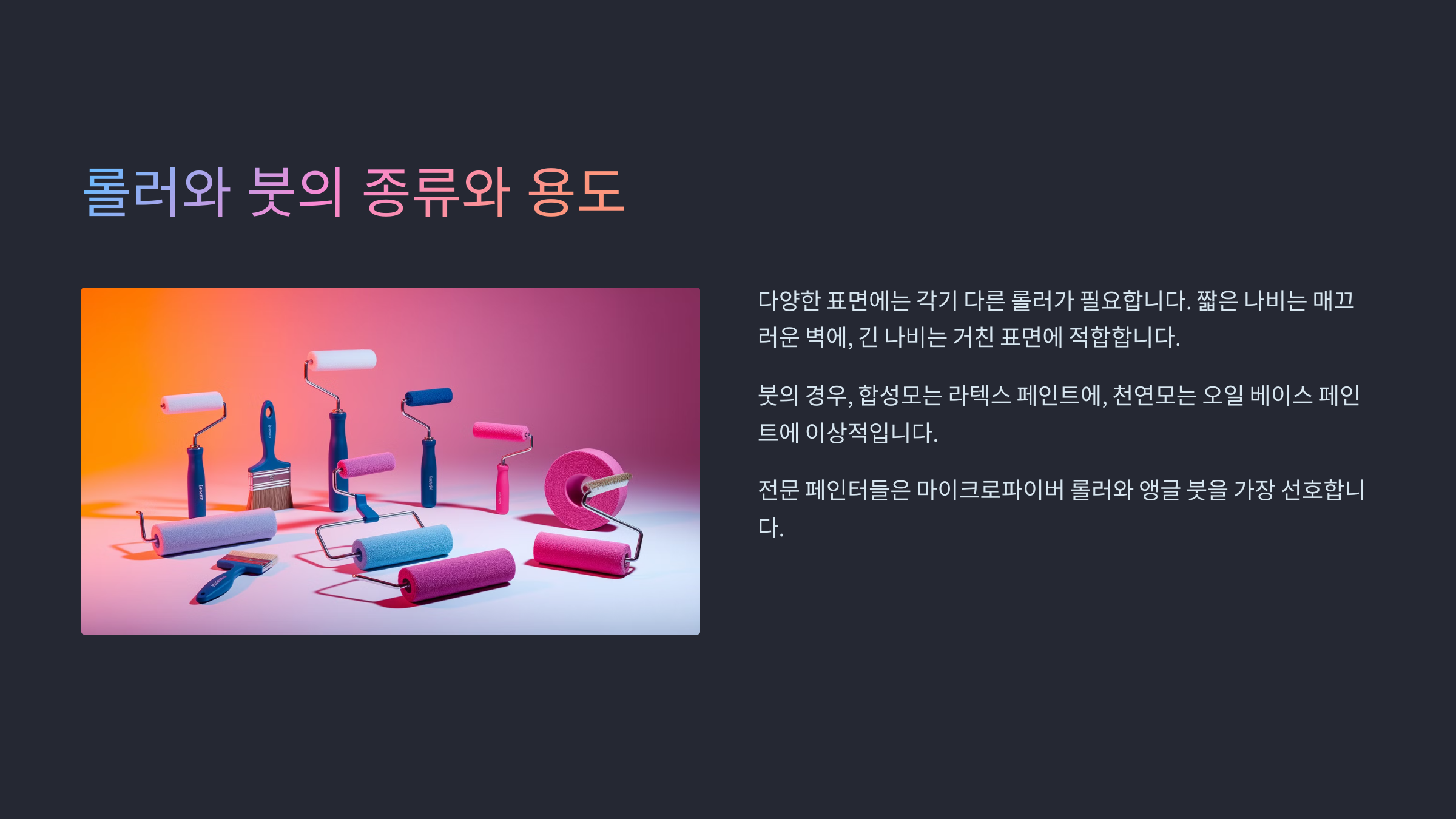 ๋กค๋ฌ๋ ๋์ ๋ฉด์ ์ ๋น ๋ฅด๊ฒ ์น ํ ์ ์๊ฒ ๋์์ฃผ๋ ๋๊ตฌ์์. ์ฒ์ฅ์ด๋ ๋ฒฝ์ฒ๋ผ ํฐ ๋ฉด์ ์์ฃผ ์ ํฉํ์ฃ . ๋กค๋ฌ์ ๊ธธ์ด๋ ์ปค๋ฒ ์ข ๋ฅ์ ๋ฐ๋ผ ์ ํฉํ ์ฉ๋๊ฐ ๋ฌ๋ผ์. ๋จ๋ชจ(ํธ์ด ์งง์) ๋กค๋ฌ๋ ๋งค๋ํ ๋ฒฝ์, ์ฅ๋ชจ ๋กค๋ฌ๋ ๊ฑฐ์น ๋ฒฝ์ ์ข์์.