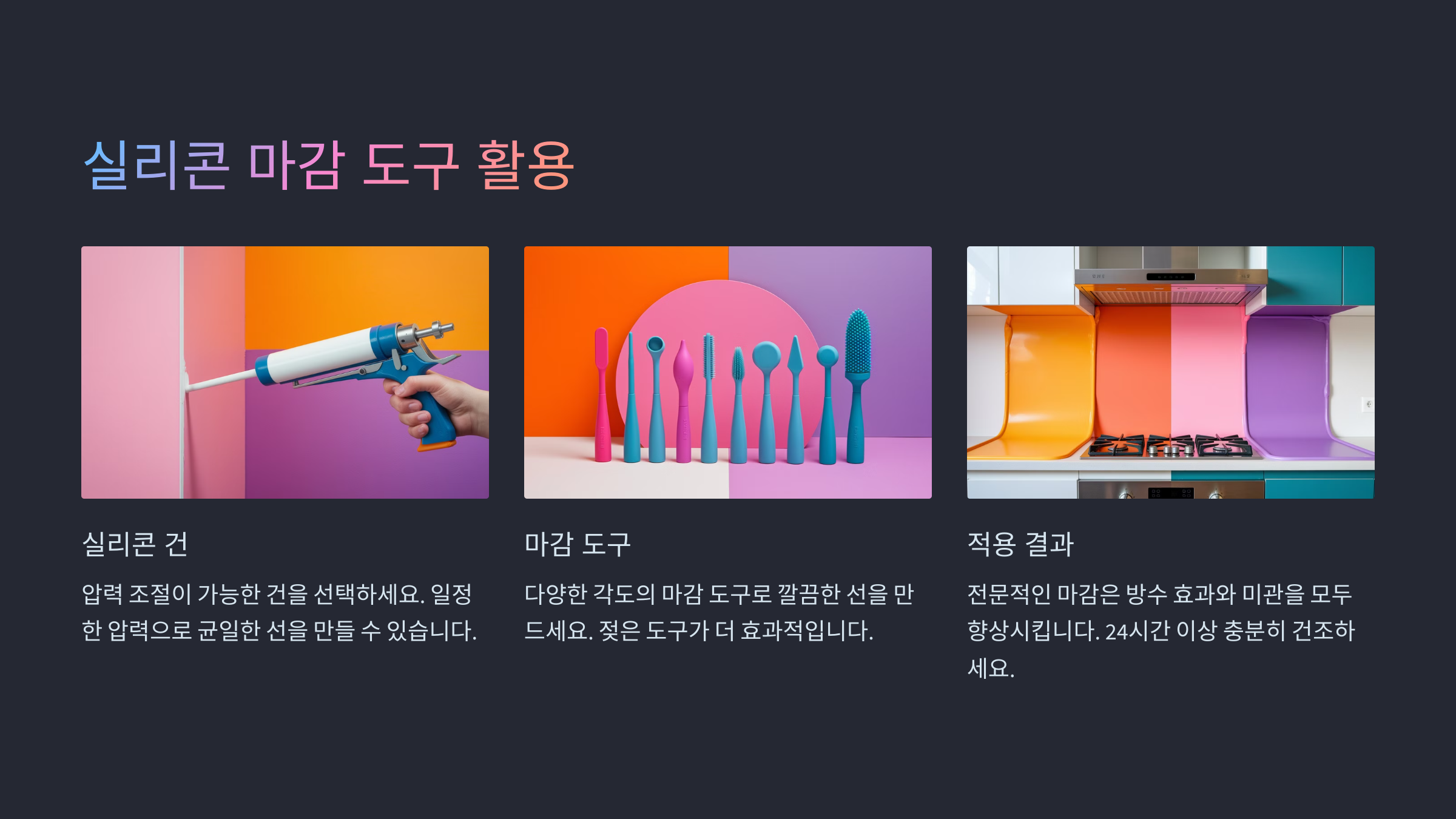 ์ค๋ฆฌ์ฝ ์์ ์ ‘๋ํ ์ผ์ ์์ ’์ด์์. ๋ง์ง๋ง ํฐ์น๋ก ๊ณต๊ฐ์ ์์ฑํ๋ ๋๋! ํนํ ์์ค์ด๋ ์ฐฝํ์ฒ๋ผ ๋ฌผ์ด ๋ฟ๋ ๊ณณ์ ๋ง๊ฐ์ด ์ ๋๋ก ๋์ด์ผ ๊ณฐํก์ด๋ ์ ์๊ธฐ๊ณ ์ค๋๊ฐ์. ๐