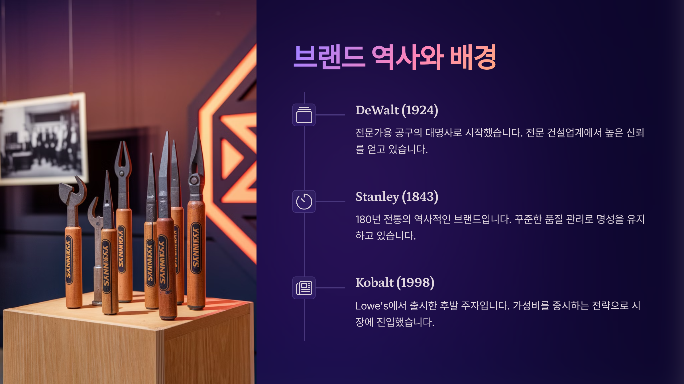 Kobalt๋ ์ผ์ ์๋ฆฌ์ ์ ํฉํ๊ณ , Stanley๋ ํด๋์ฑ๊ณผ ๊ธฐ๋ณธ ํด์ ์ค์ ์ ๋๊ณ ์์ผ๋ฉฐ, DEWALT๋ ‘ํ์ํ ๋งํผ๋ง’ ๋ด๊ธด ๊ณ ์ฑ๋ฅ ์ค์ฌ์ด์์.