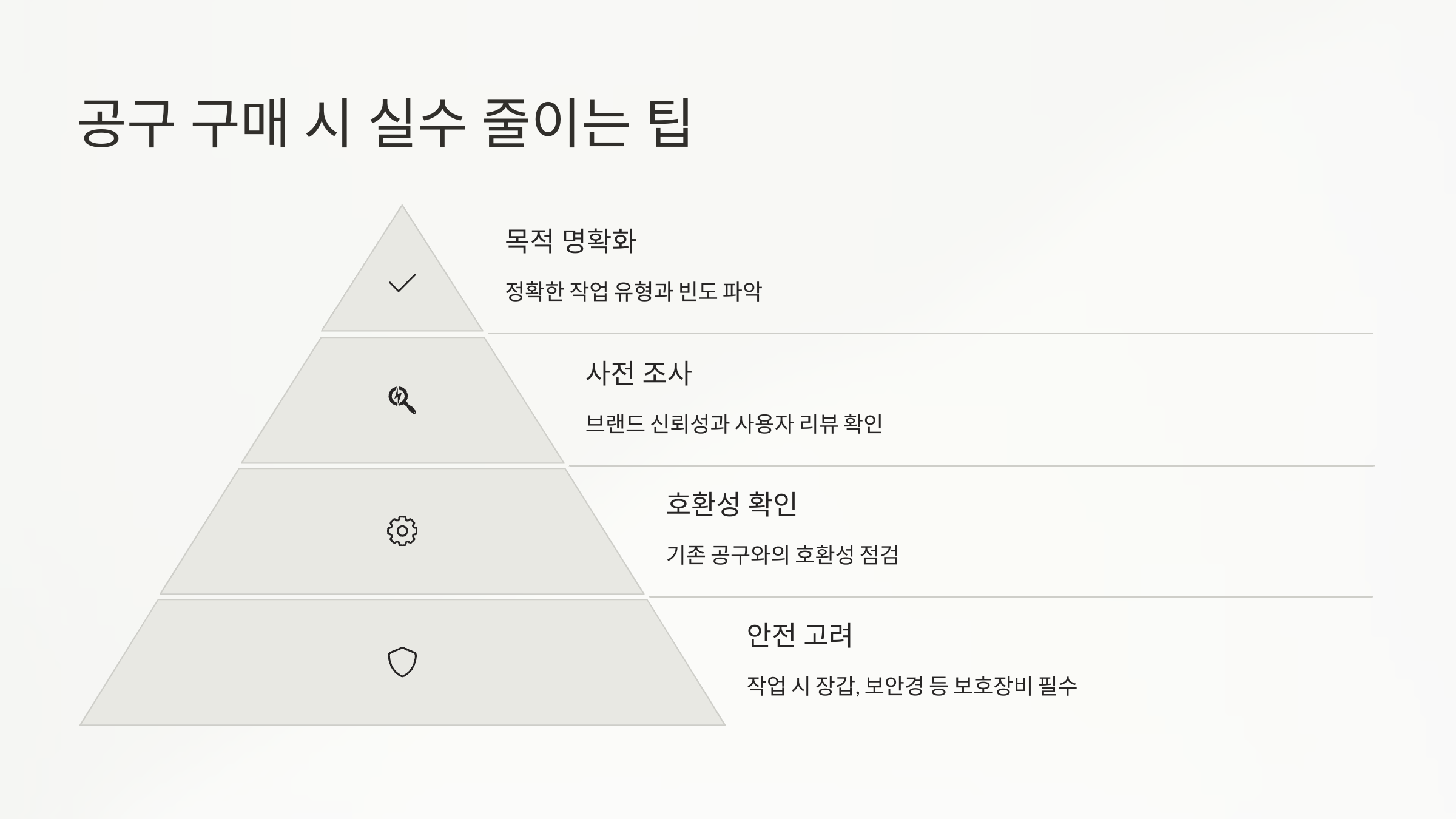 ๋ ๋ฒ์งธ๋ **์ธํธ ์ํ๋ณด๋ค ๋ฑ๊ฐ ๊ตฌ์ ์ ๋จผ์ ์๋**ํด๋ณด๋ ๊ฑฐ์์. ์ด๋ณด์์ผ์๋ก ์ ์ฉ ์ธํธ๋ฅผ ์ฌ๊ณ ํํํ๋ ๊ฒฝ์ฐ๊ฐ ๋ง์์. ์ ์ฐ๋ ๊ณต๊ตฌ๊ฐ ์ ๋ฐ ์ด์์ด ๋ ์ ์๊ฑฐ๋ ์. ์์ฃผ ์ฐ๋ ๋๊ตฌ๋ถํฐ ํ๋์ฉ ๋ง์ถฐ๊ฐ๋ ๊ฒ ๋ ํจ์จ์ ์ด์์.