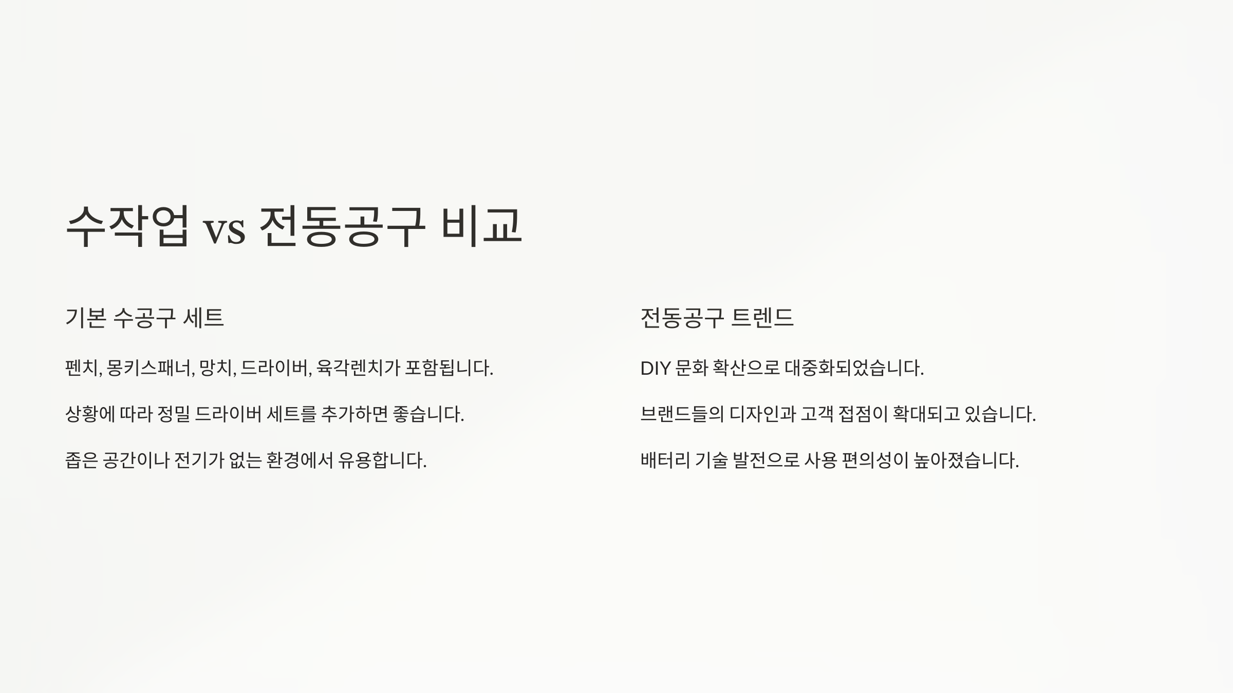 ๋ฐ๋ฉด์ **์ ๋๊ณต๊ตฌ**๋ ์๋์ ํ์์์ ํ์คํ ์ฐจ์ด๊ฐ ๋์. ๋ฐฐํฐ๋ฆฌ ๊ธฐ๋ฐ์ผ๋ก ์๋ํ๊ธฐ ๋๋ฌธ์ ๋ฐ๋ณต ์์ ์ด๋ ๋๋ ์์ ์ ํผ๋ก๋๋ ์ค์ฌ์ฃผ๊ณ ํจ์จ์ด ํฌ๊ฒ ์ฌ๋ผ๊ฐ์. ์๋ฅผ ๋ค์ด ํ์ดํ ์ปคํฐ, ์ ๋ ๋๋ฆด, ์ต๊ธ ๊ทธ๋ผ์ธ๋ ๋ฑ์ ์์ ์๊ฐ์ ๋ฐ ์ด์ ๋จ์ถ์์ผ์ค์.