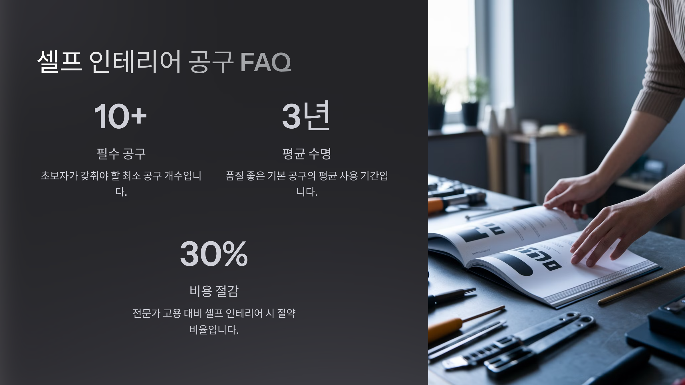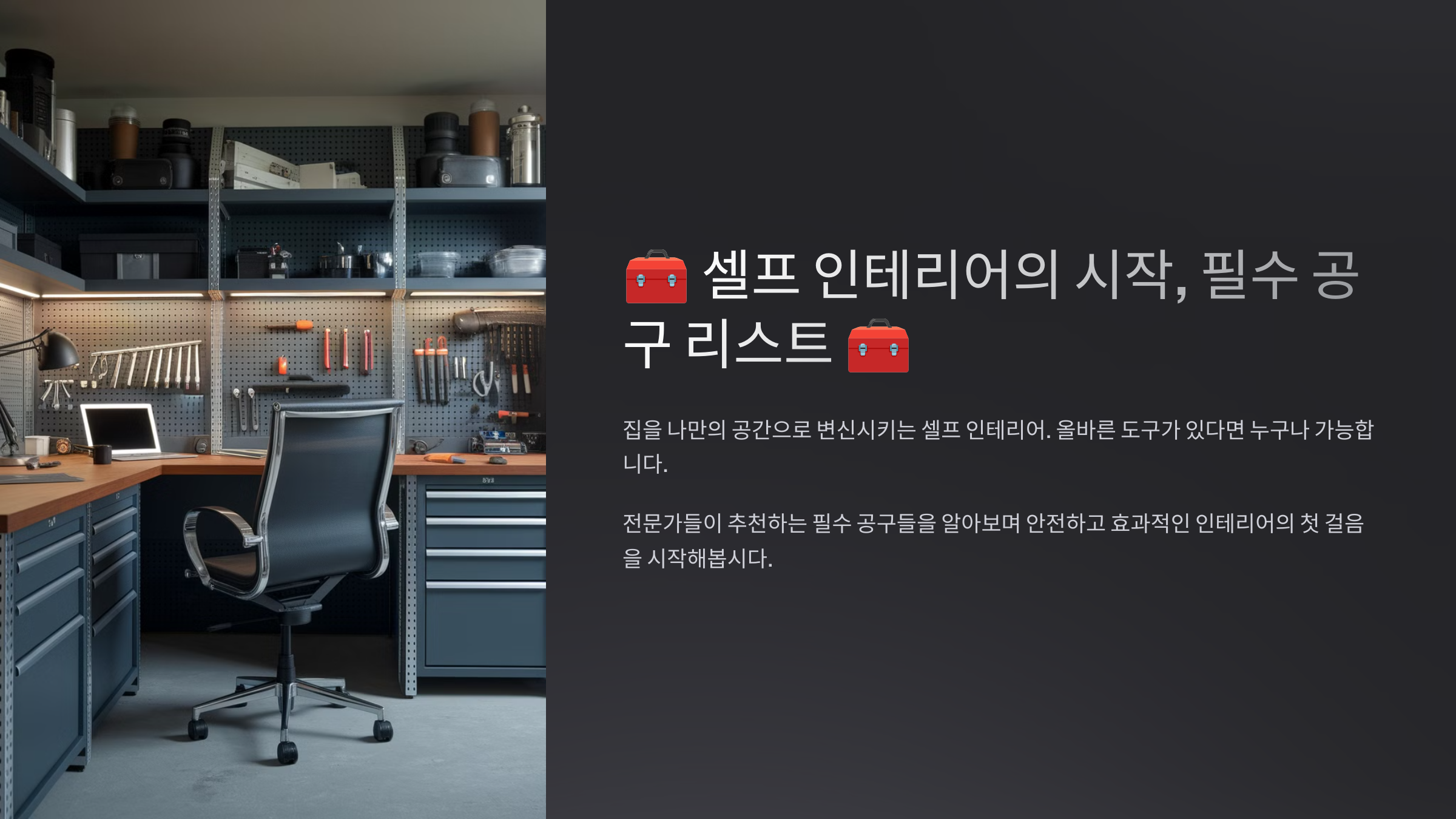 μ ν μΈν 리μ΄λ₯Ό μ€λΉν λ κ°μ₯ λ¨Όμ μ±κ²¨μΌ ν 건 λ°λ‘ λ€μν 곡ꡬλ€μ΄μμ. λλ°°, νμΈνΈμΉ , κ°κ΅¬ 쑰립, μ λ° μ€μΉ λ± λ€μν μμ μ νλ€ λ³΄λ©΄ κΌ νμν λꡬλ€μ΄ νλλ λμ΄λκ² λμ£ . κ·Έλμ μ€λμ μ ν μΈν 리μ΄λ₯Ό ν λ κΈ°λ³Έμ μΌλ‘ μμμΌ ν νμ 곡ꡬλ€μ μκ°ν΄λ³Όκ²μ.