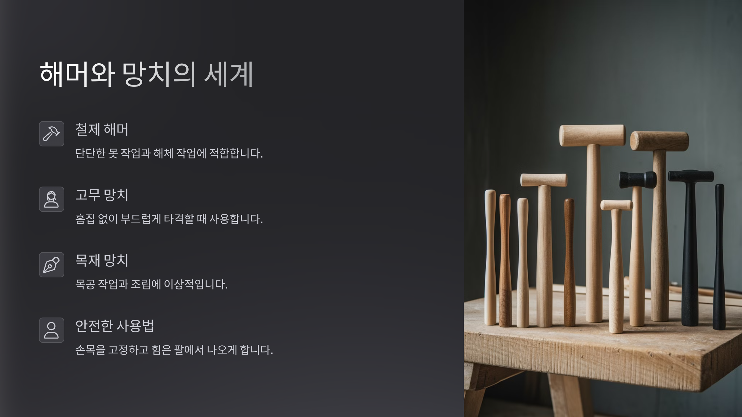 λλ μΈν λ¦¬μ΄ μ΄λ³΄μΈλ° μ΄λ€ λ§μΉλ₯Ό μ¬μΌ νλ? μ΄λ΄ λ βν΄λ‘ ν΄λ¨Έ + κ³ λ¬΄λ§μΉβ μ‘°ν©μ΄λ©΄ μ¬λ§ν μμ μ λλΆλΆ μ»€λ² κ°λ₯ν΄μ. λ λ€ λ¬΄κ²μ§ μμΌλ©΄μ κΈ°λ₯μ μΌλ‘ λ€μν΄μ λΆλ΄ μμ΄ μμν μ μμ΄μ. κ·Έλ¦¬κ³ μμ μ λ§λ 그립κ°λ κΌ μ²΄ν¬ν΄λ³΄λ κ² μ’μμ!