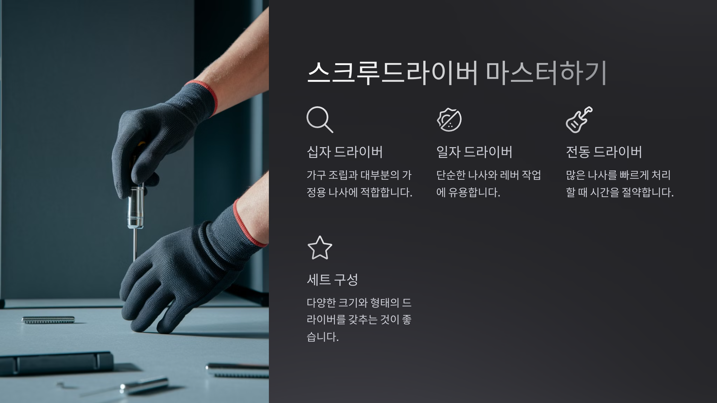 리μ΄μμ μ λ λΉ μ§ μ μλ ν΅μ¬ λꡬμμ. λͺ»μ λ°λ κ²λ³΄λ€ λμ¬λ₯Ό μ‘°μ΄λ κ²½μ°κ° ν¨μ¬ λ§κΈ° λλ¬Έμ μ€ν¬λ£¨λλΌμ΄λ²λ κΌ κ°μΆ°μΌ ν΄μ. λλΌμ΄λ²λ ν¬κ² μΌμν(νλ«)κ³Ό μμν(ν립μ€)μΌλ‘ λλκ³ , μ΅κ·Όμ μ‘κ°ν, λ³λͺ¨μκΉμ§ λ€μν ννκ° μμ΄μ. 보ν΅μ μμ λλΌμ΄λ² νλλ§ μμ΄λ λλΆλΆμ κ°κ΅¬λ μ μμ νμ 쑰립ν μ μμ΄μ.